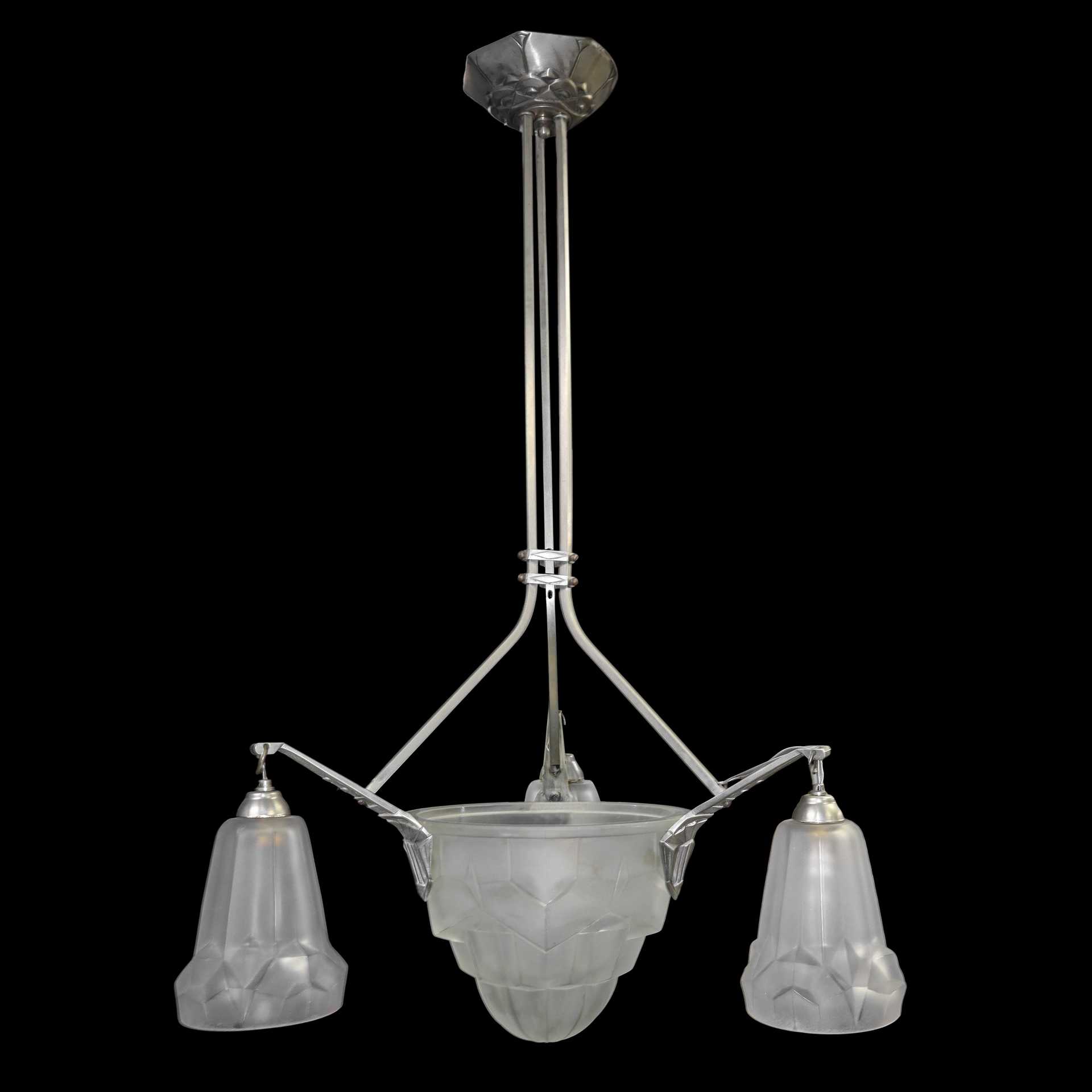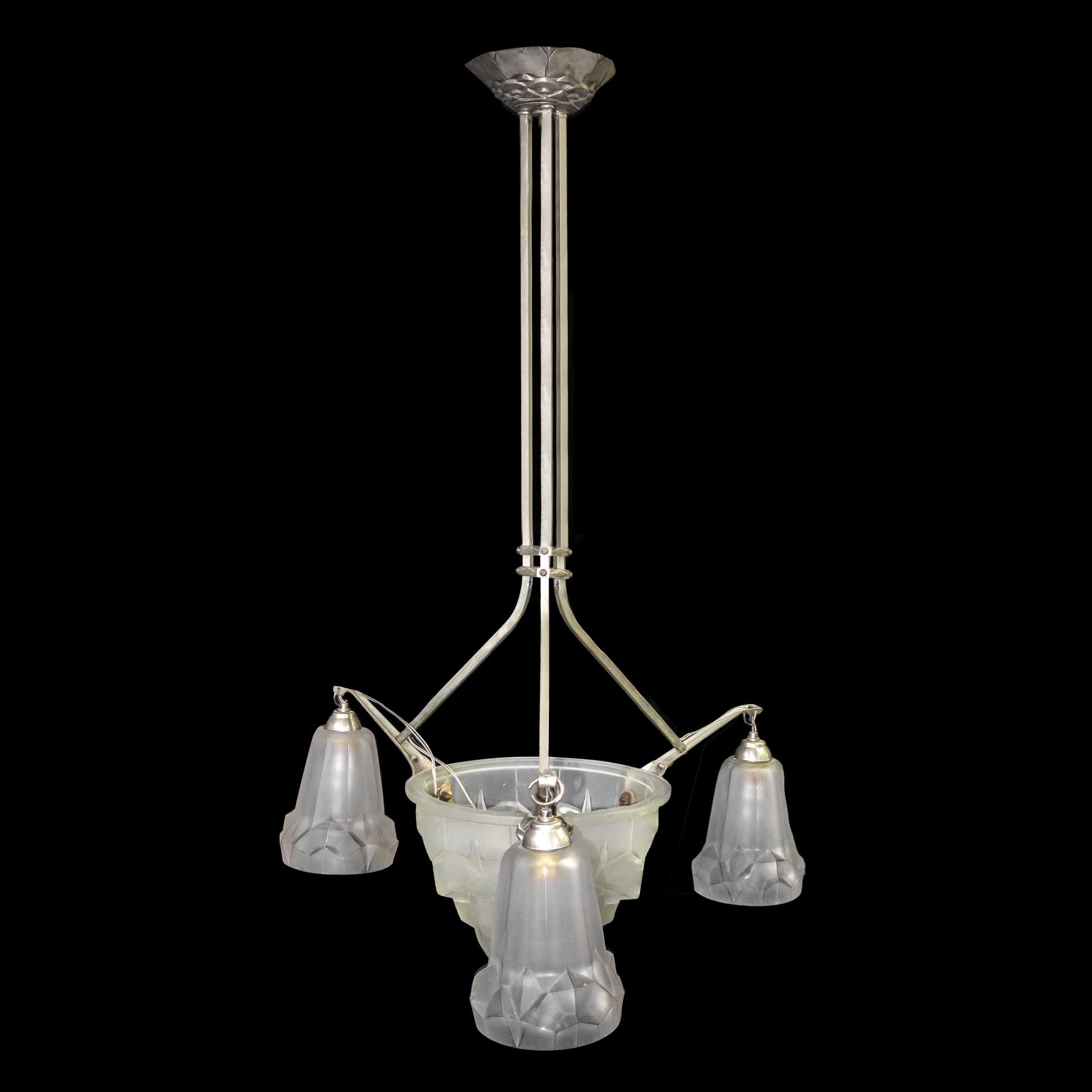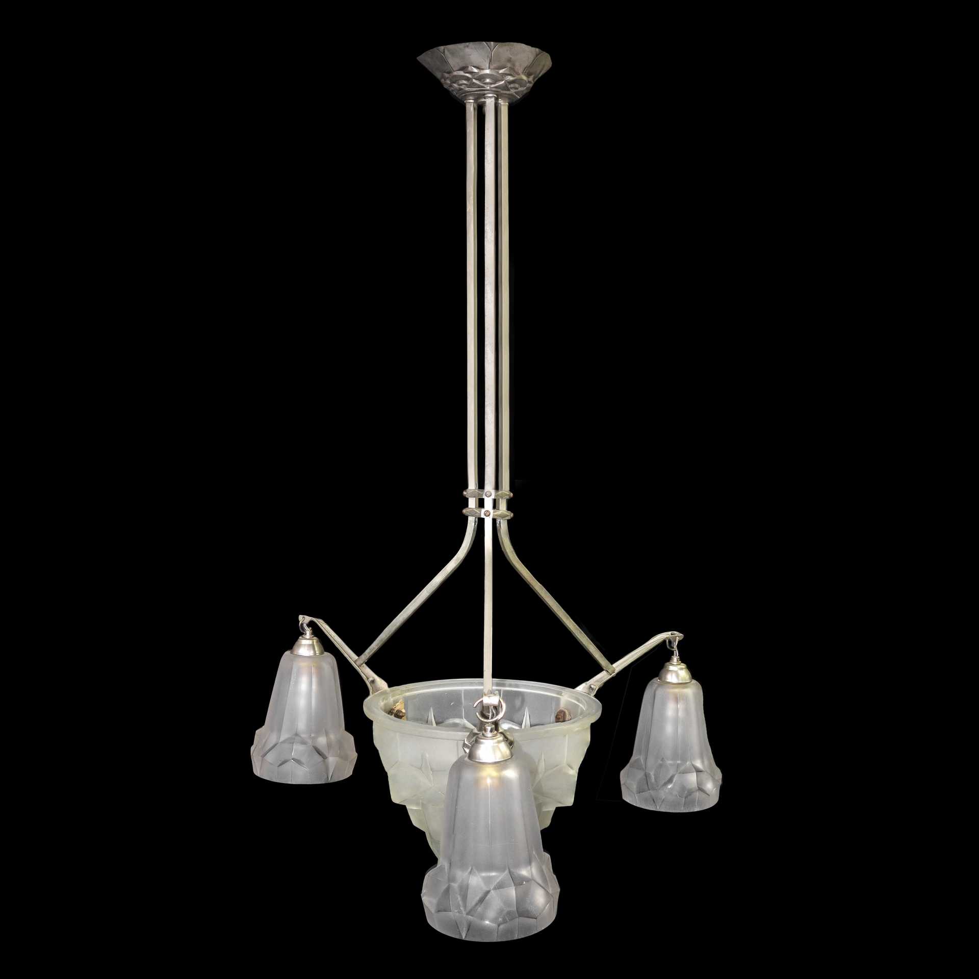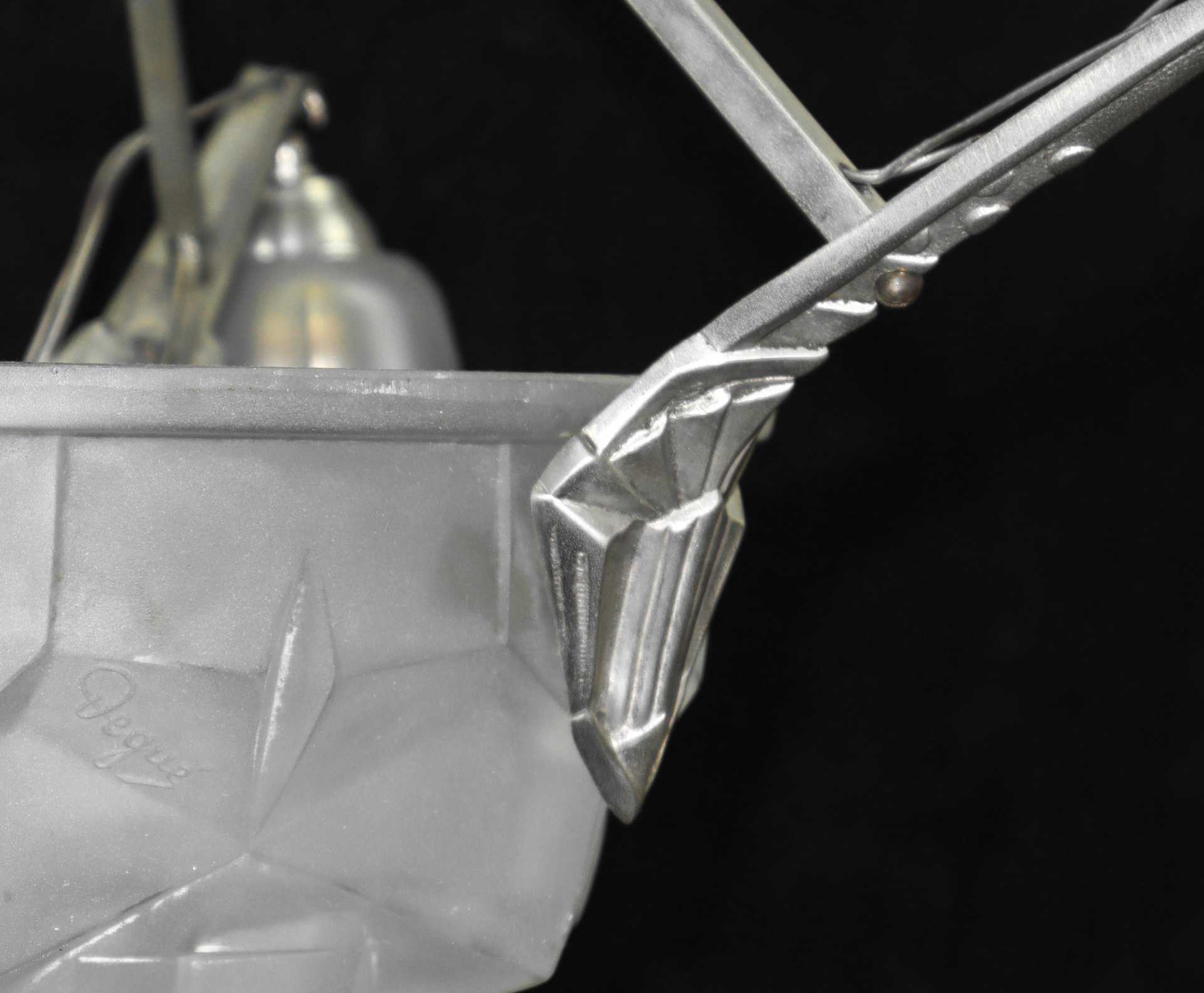 David Gueron Degue & A. Petitot - Lampadario a sospensione Art Decò francese, in vetro sabbiato con geometrie, 1930s h cm 86X53 Coppa con tre luci a campana. Firmato DegueCoppa con tre luci a campana. Firmato Degue