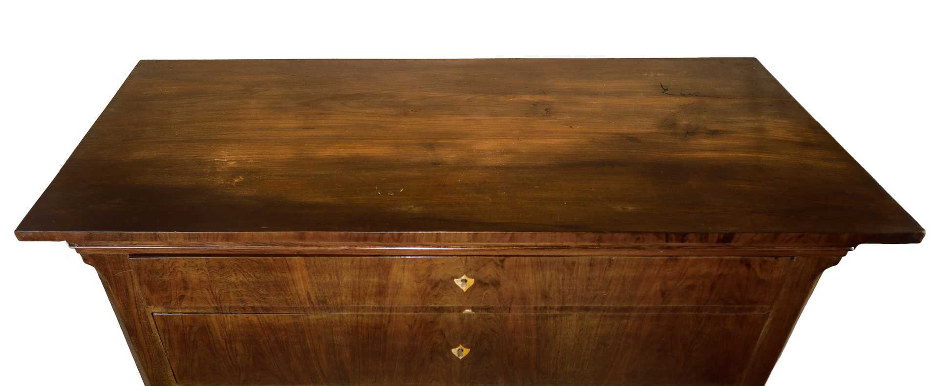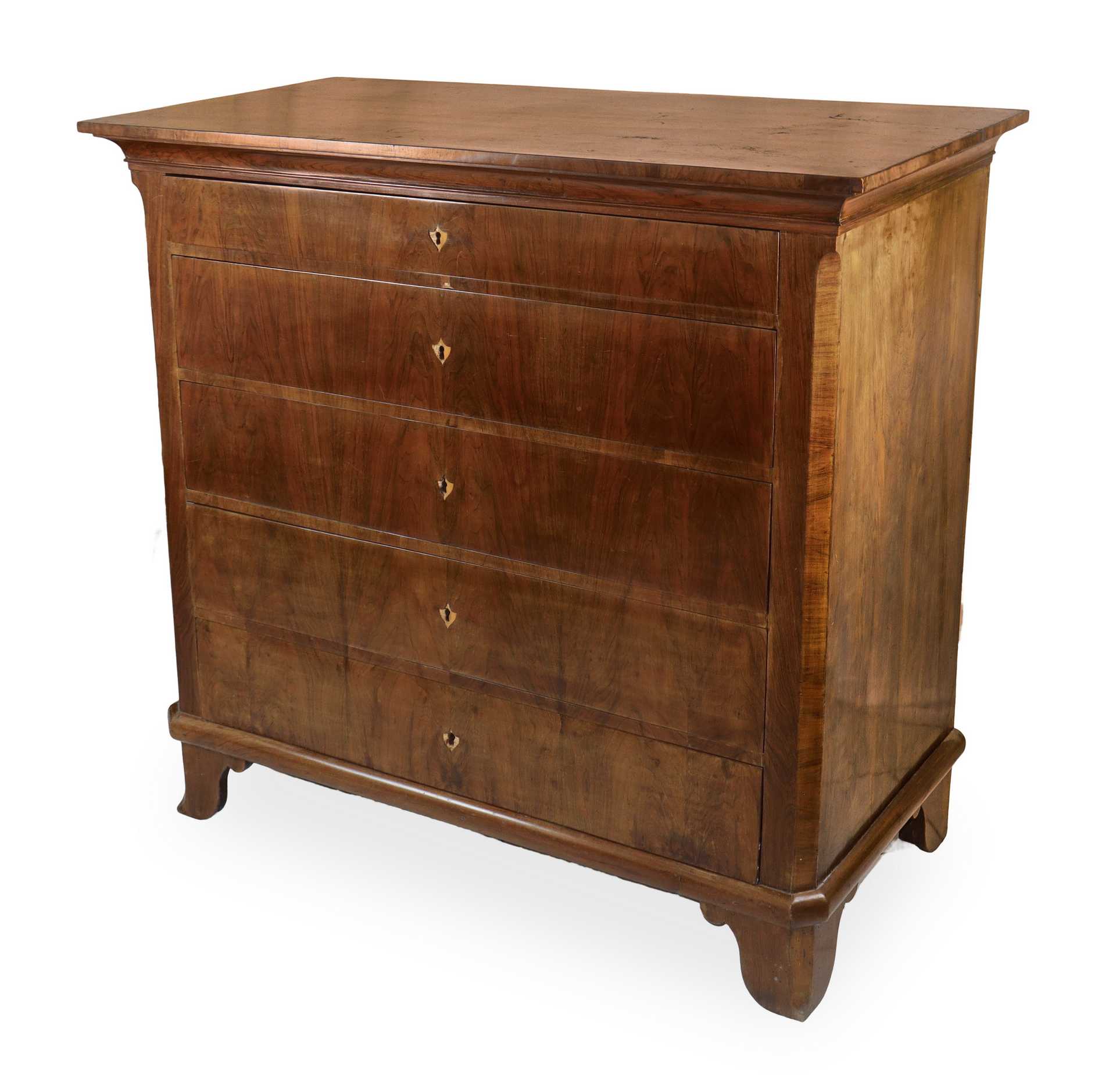 Cassettone a 5 cassetti in legno e radica di noce , Sicily 19° secolo 125 x 127,5 x 58 cm angoli smussati bocchete a scudo e piedi a mensola angoli smussati bocchete a scudo e piedi a mensola