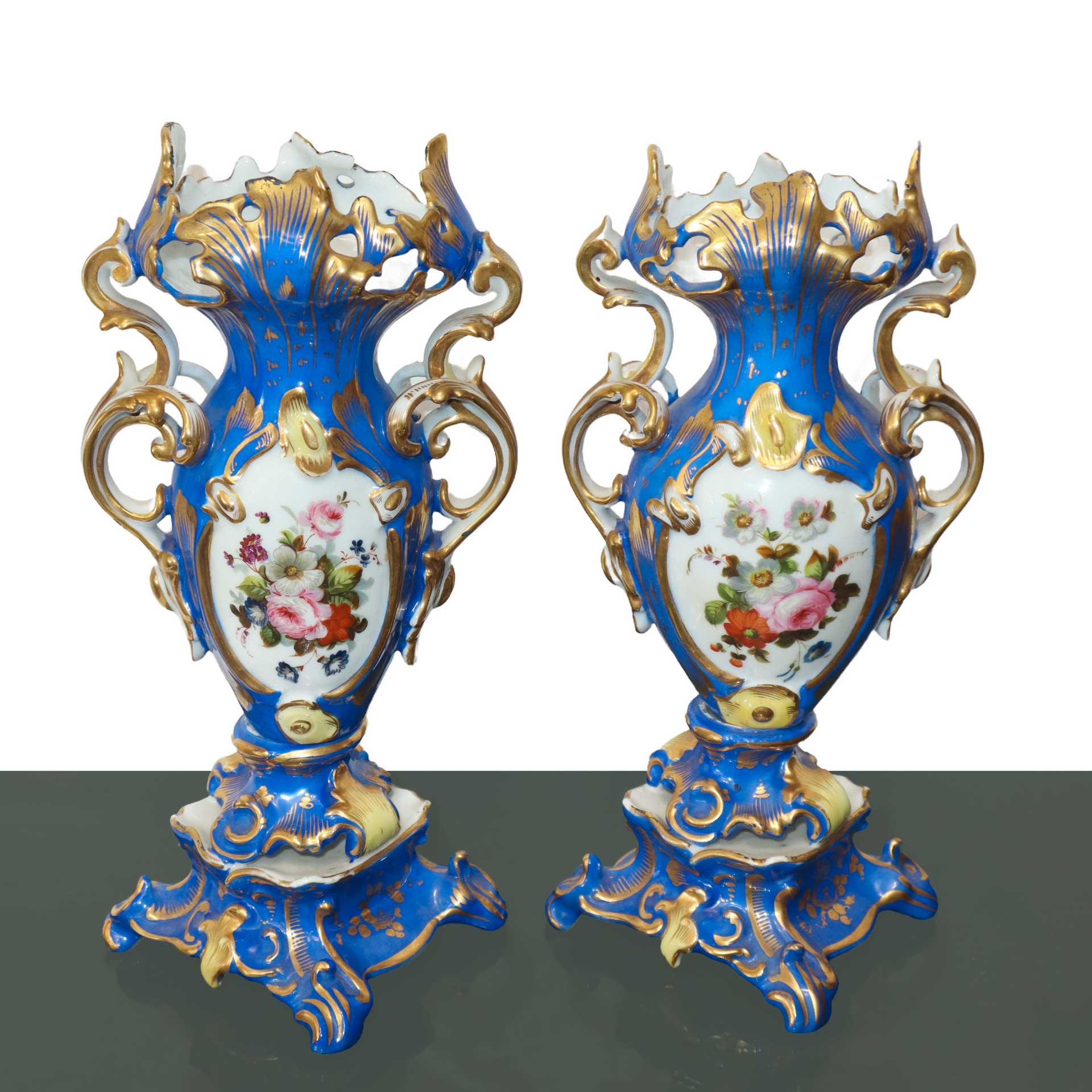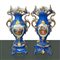 Coppia di vasi in porcellana Luigi Filippo blu e dorati con decori floreali, France 19° secolo