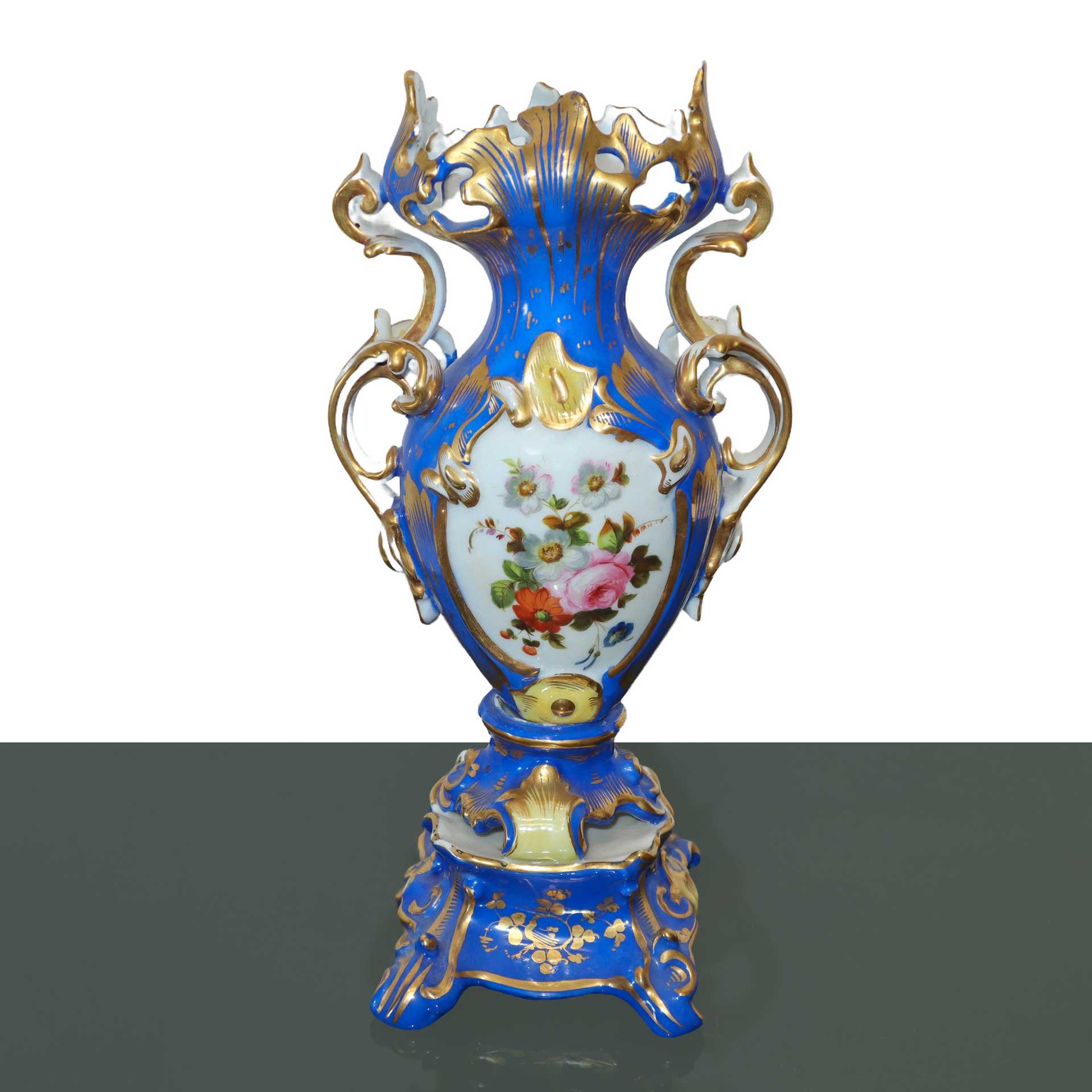 Coppia di vasi in porcellana Luigi Filippo blu e dorati con decori floreali, France 19° secolo h cm 30X15