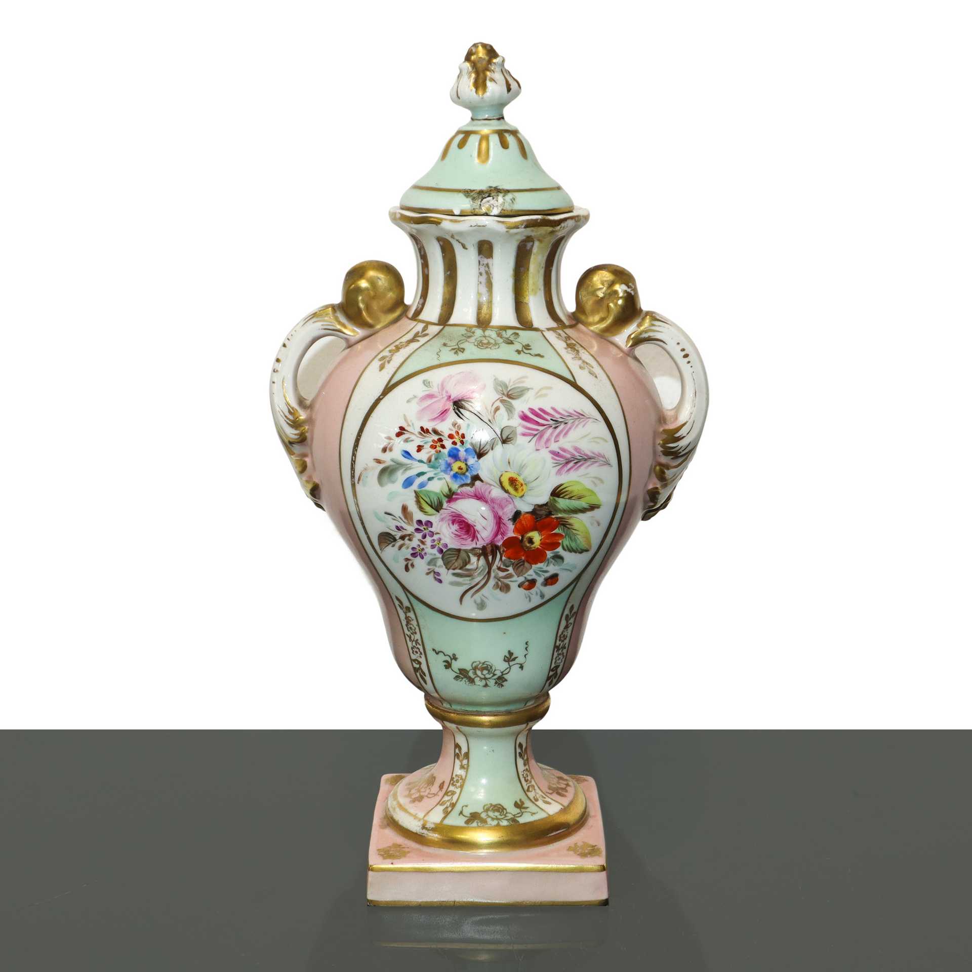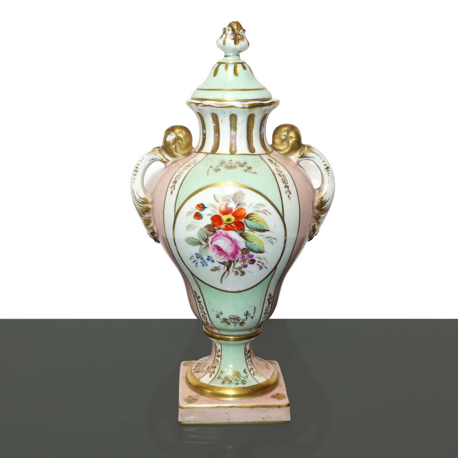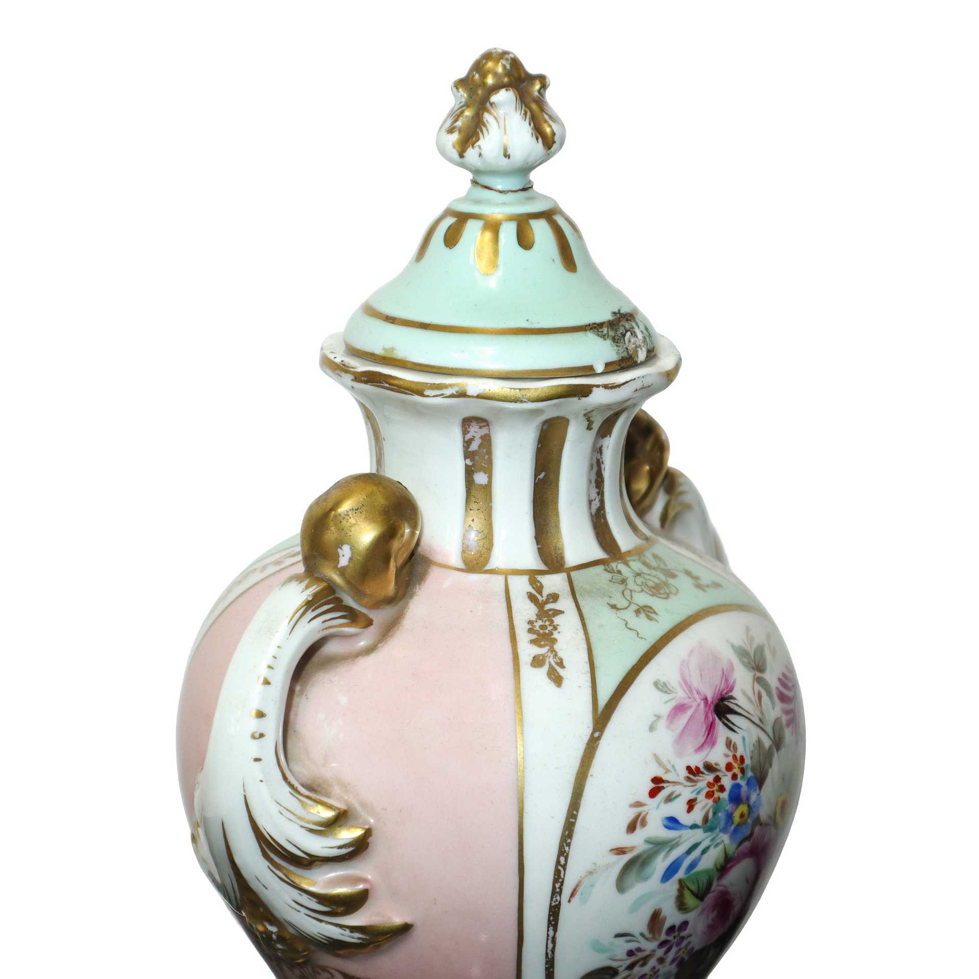 Sevres Porcellana - Vaso poutiche policromo a motivi floreali, Primi 20° secolo h cm 32 base cm 9X9 Marchio alla base. Piccola sbeccatura e filature sul coperchio Marchio alla base. Piccola sbeccatura e filature sul coperchio