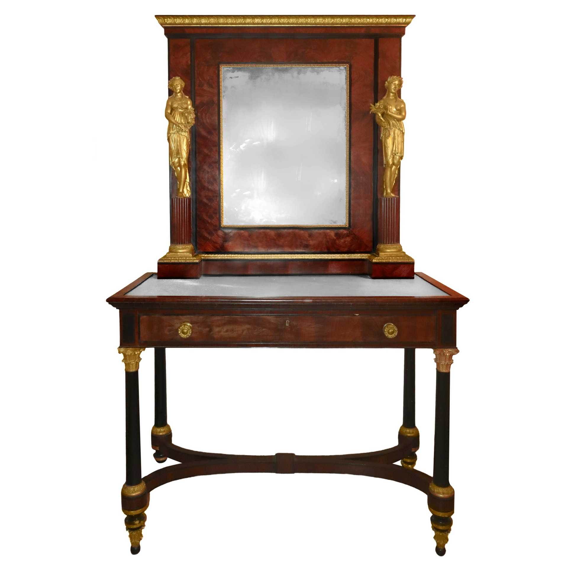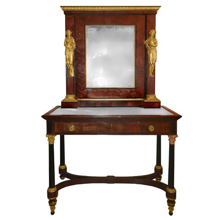 Marmo incassato al piano,cassetto a sottopiano, gambe a colonna con capitelli dorati riunite da una crociera, piedi a pigna con riporti a foglia oro, specchiera cm 123 x 120 con vetro al mercurio e colonne laterali portanti, sculture in legno dorato a foglia raffiguranti figure femminile (stagioni) , cornici dorate, legno in piuma di mogano