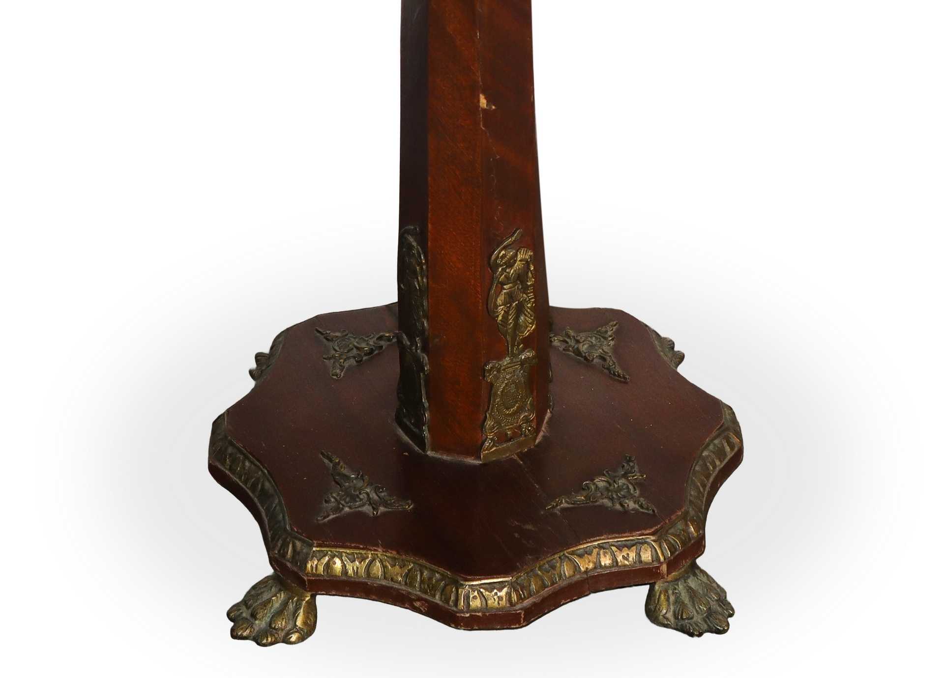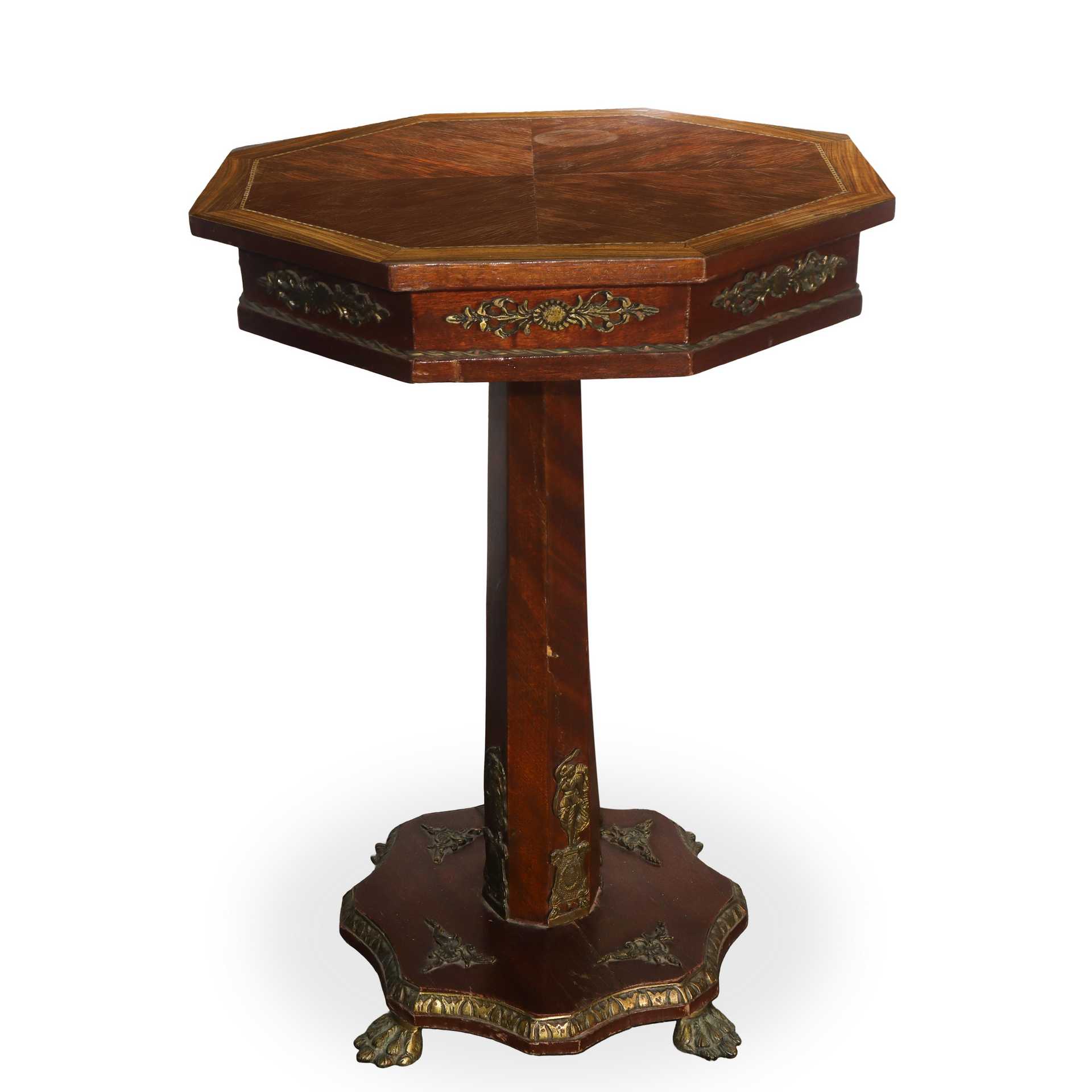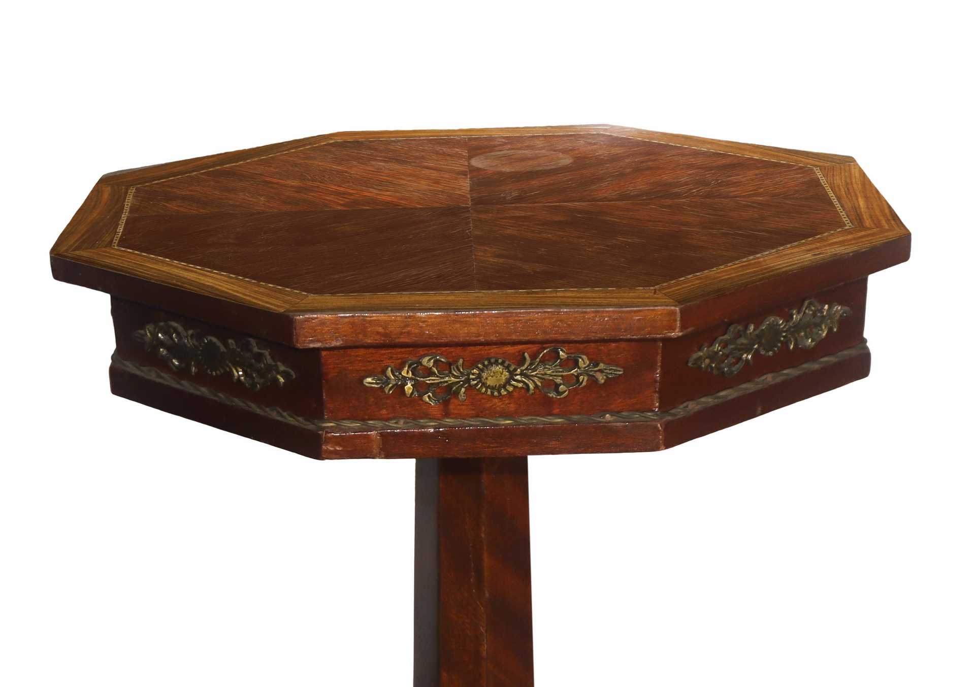 Tavolo ottagonale con piano filettato in noce chiara , Napoleon III 1860 h cm 69X47,5 Con sostegno a colonna esagonale piano ottagonale filettato in legno di mogano ai bordi e in noce chiara al centro. Sottopiano e base con bronzi applicati Con sostegno a colonna esagonale piano ottagonale filettato in legno di mogano ai bordi e in noce chiara al centro. Sottopiano e base con bronzi applicati