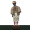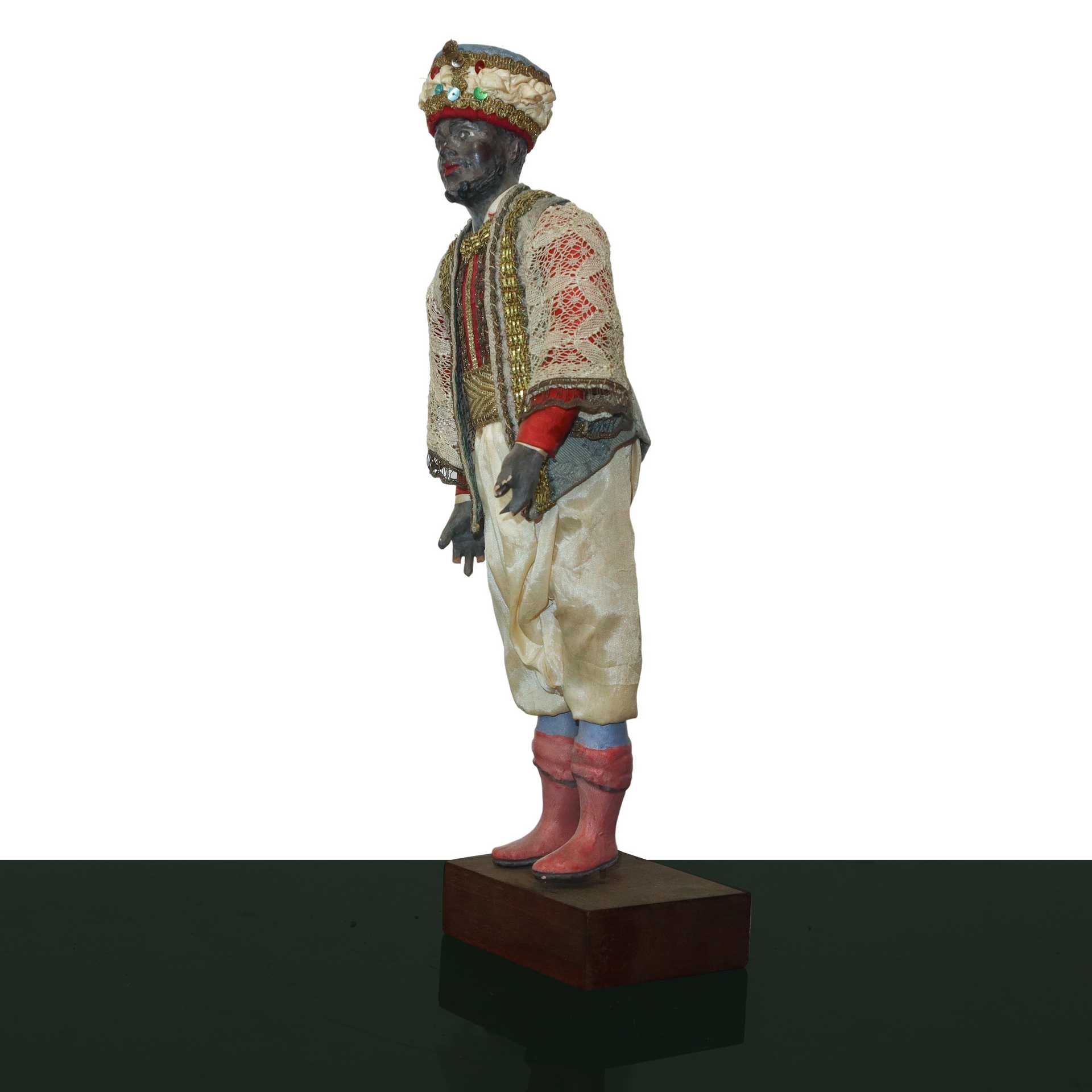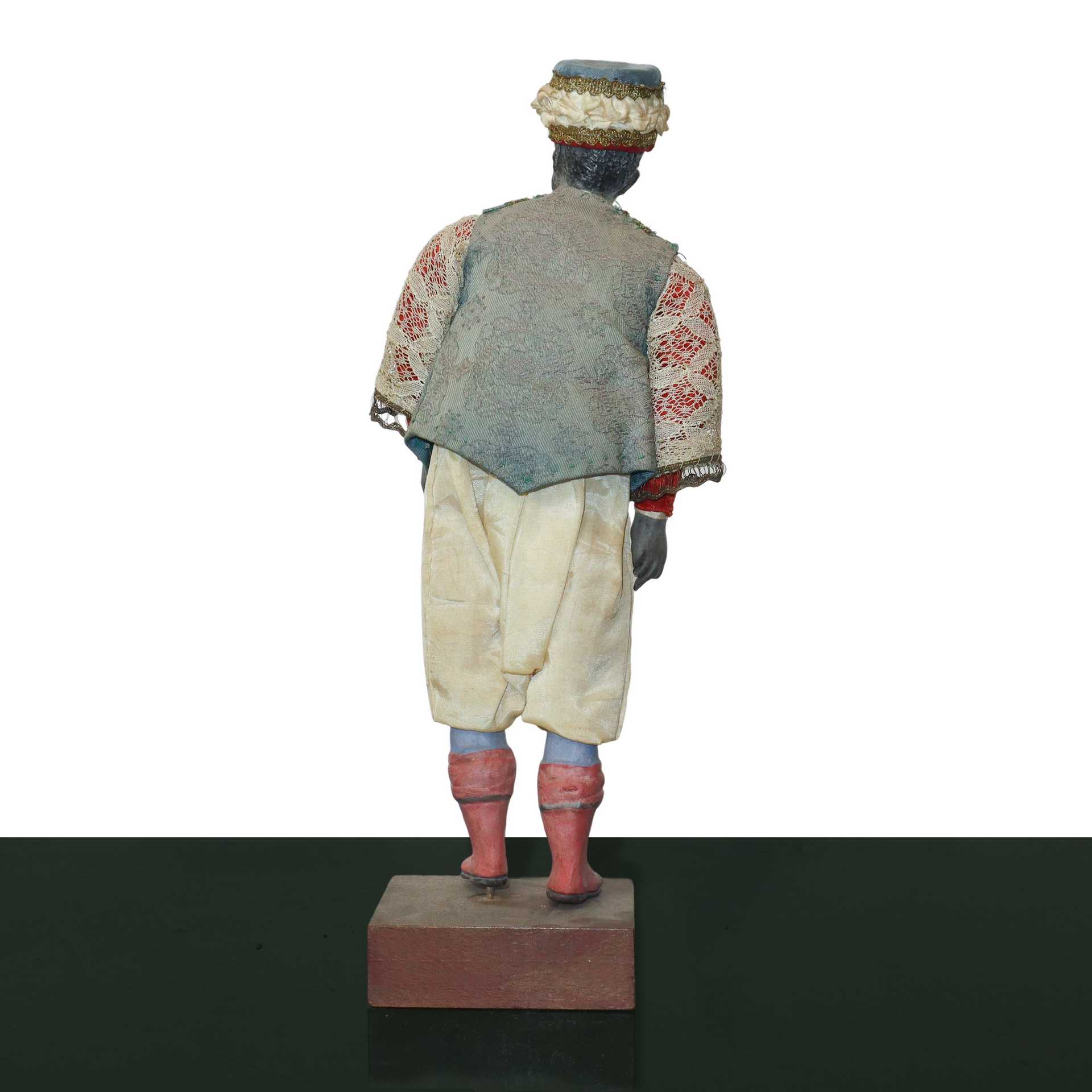 Personaggio presepiale in terracotta e legno con vesti in cotone, raso e passamaneria: moro con turbante con gilet con passamaneria oro. , Naples 19° secolo