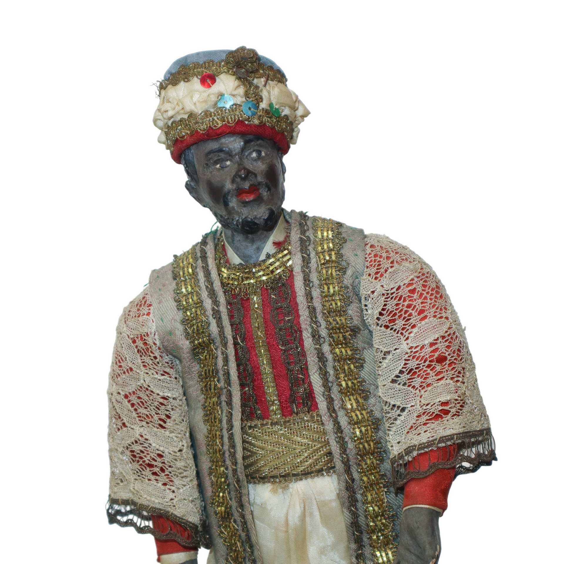 Lot 248 | Personaggio presepiale in terracotta e legno con vesti in cotone, raso e passamaneria: moro con turbante con gilet con passamaneria oro. , Naples 19° secolo
