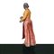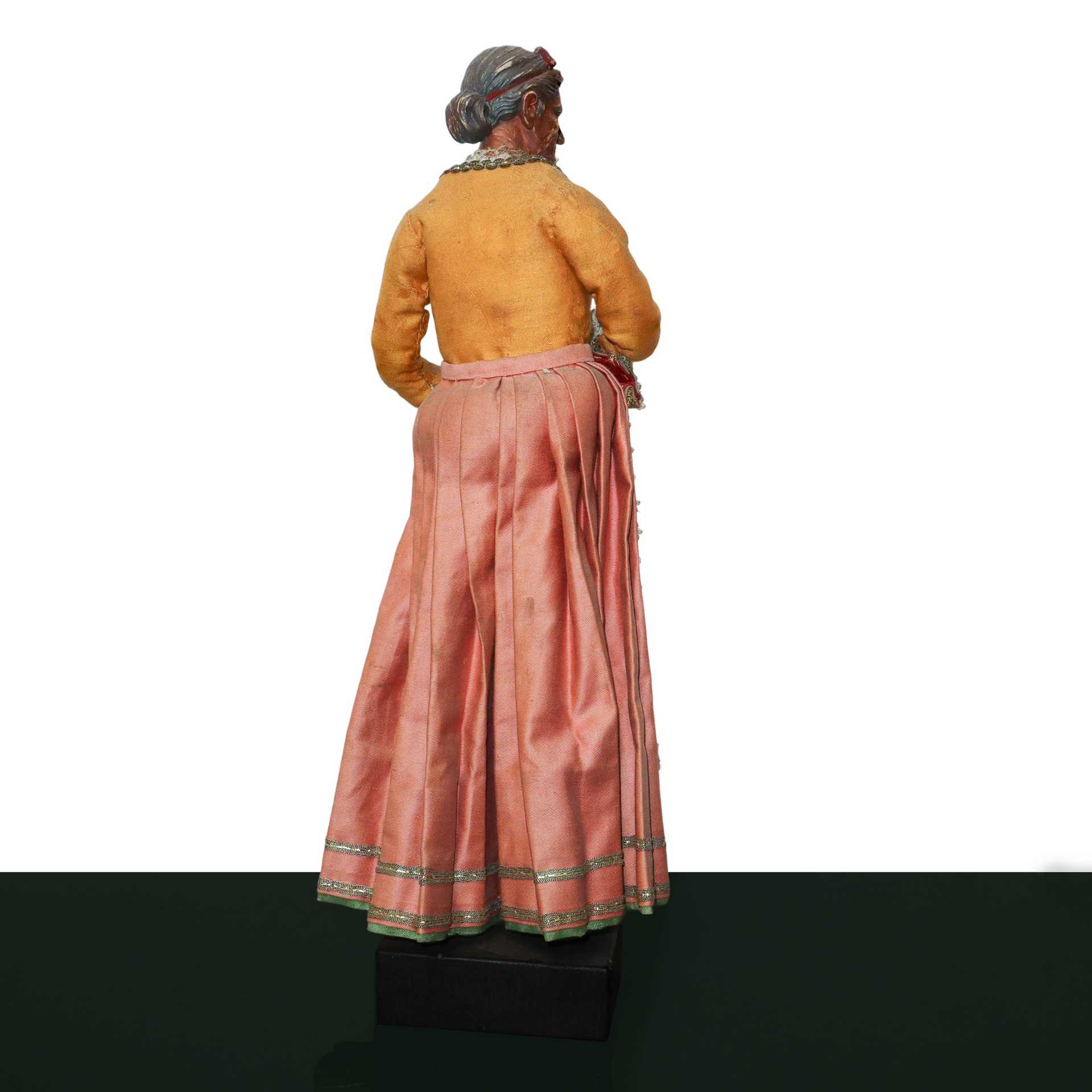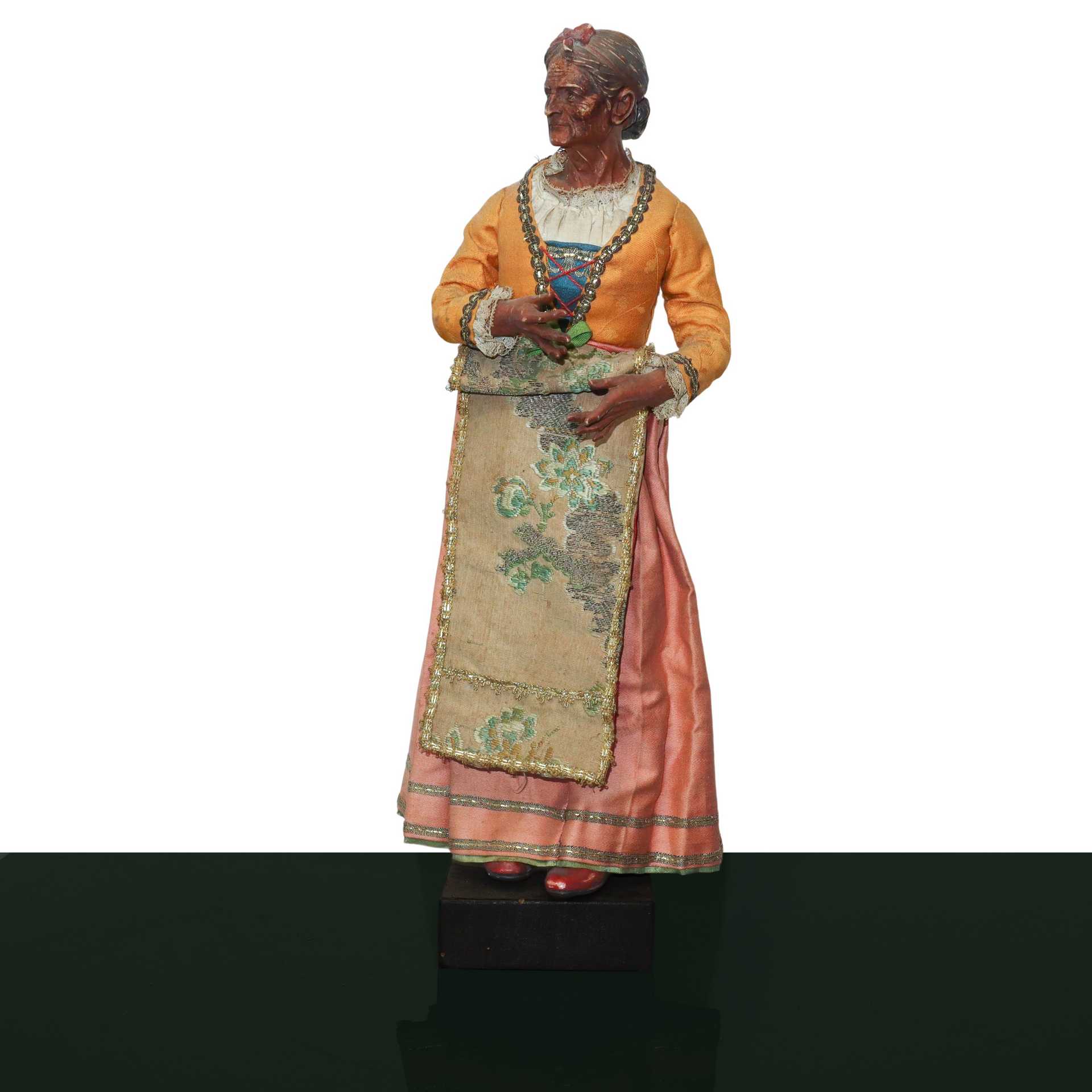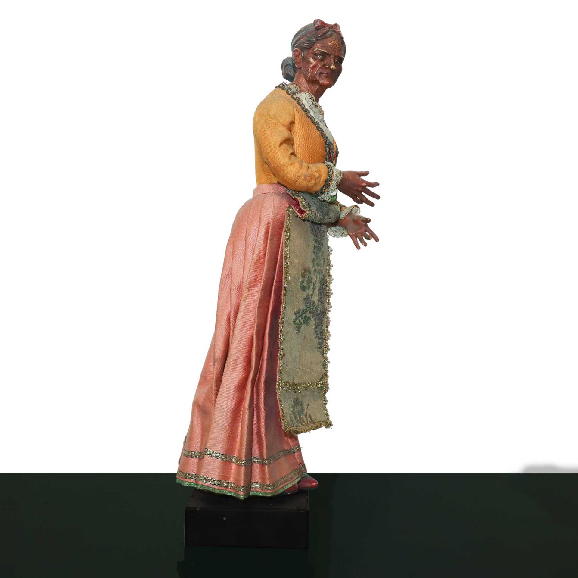 Personaggio presepiale in terracotta e legno con vesti in cotone, raso e passamaneria: massaia popolana con fiocco in testa , Naples 19° secolo