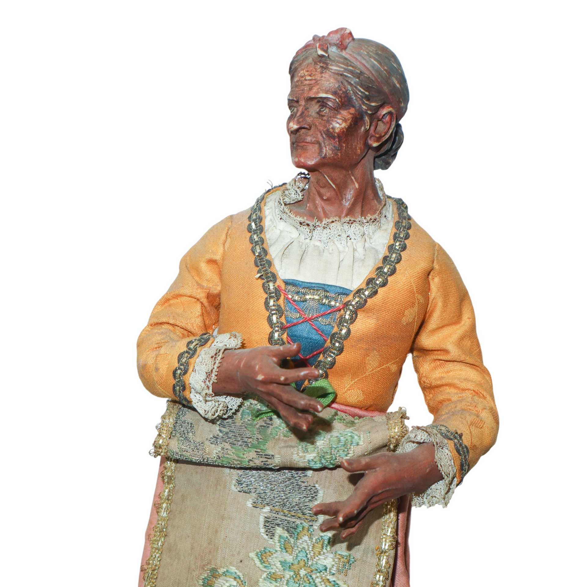 Personaggio presepiale in terracotta e legno con vesti in cotone, raso e passamaneria: massaia popolana con fiocco in testa , Naples 19° secolo h cm 40