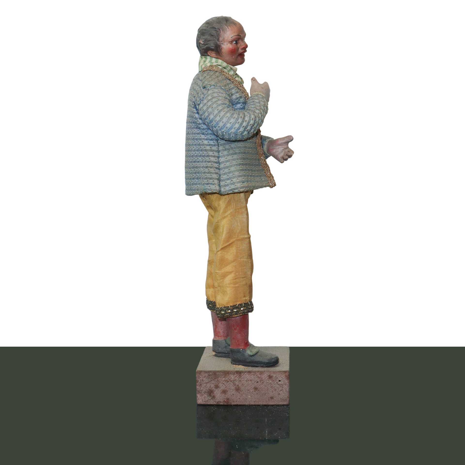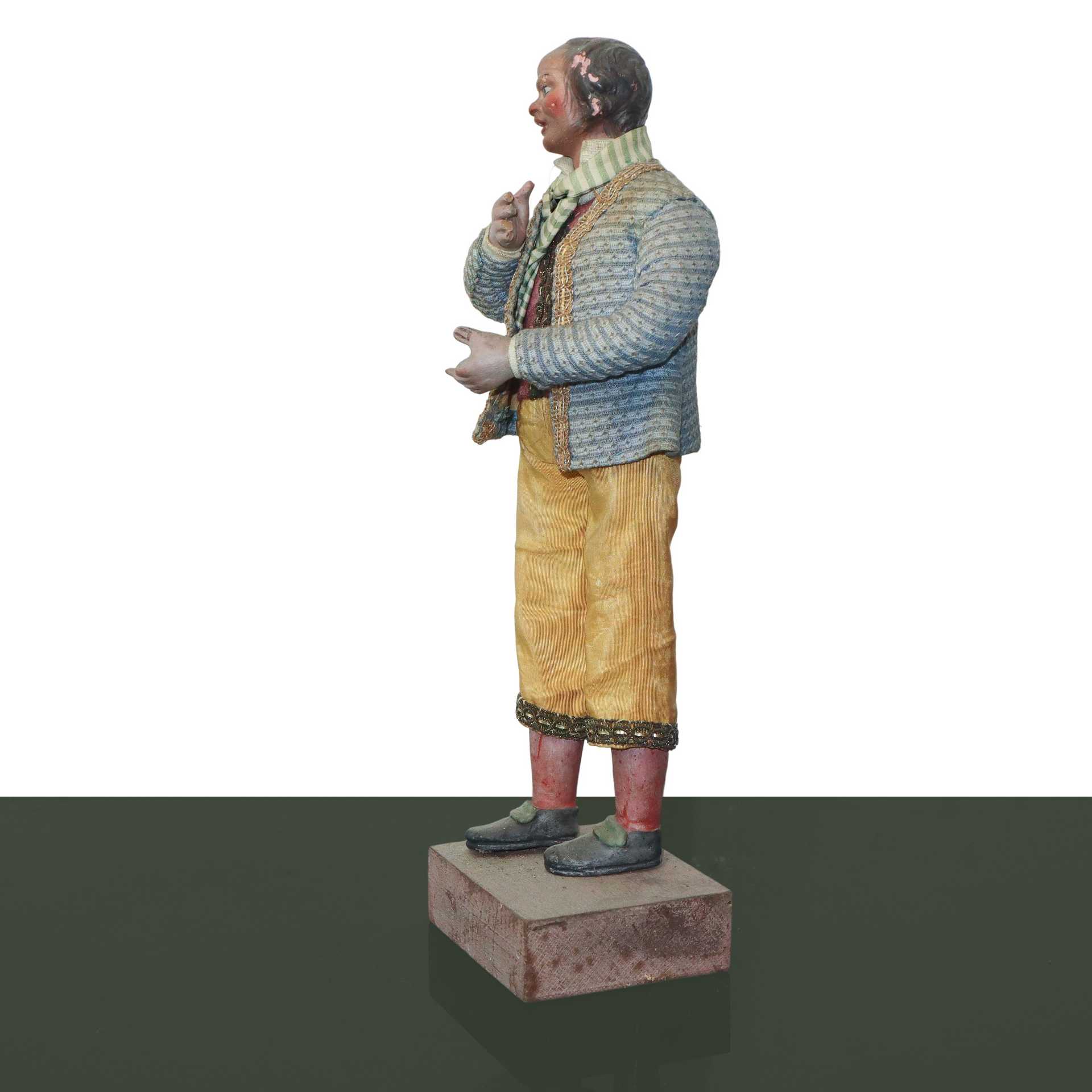 Personaggio presepiale in terracotta e legno con vesti in cotone, raso e passamaneria: : uomo con foulard e pantaloni gialli, Naples 19° secolo h cm 31