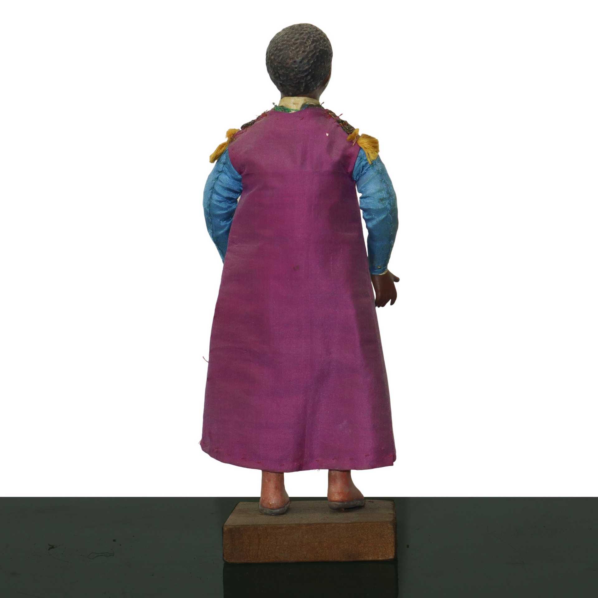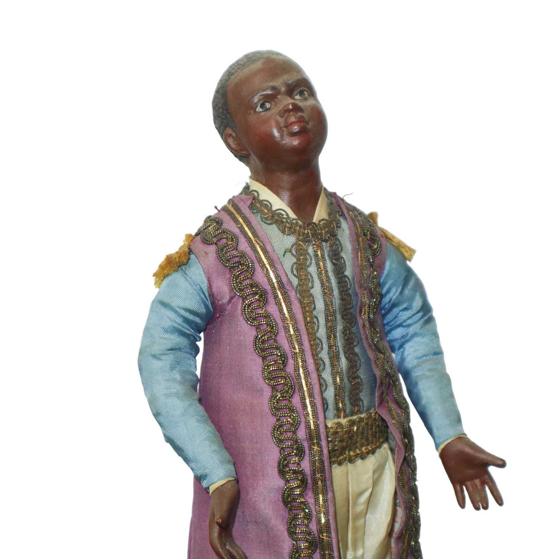 Personaggio presepiale in terracotta e legno con vesti in cotone, raso e passamaneria: bambino moro, Naples 19° secolo
