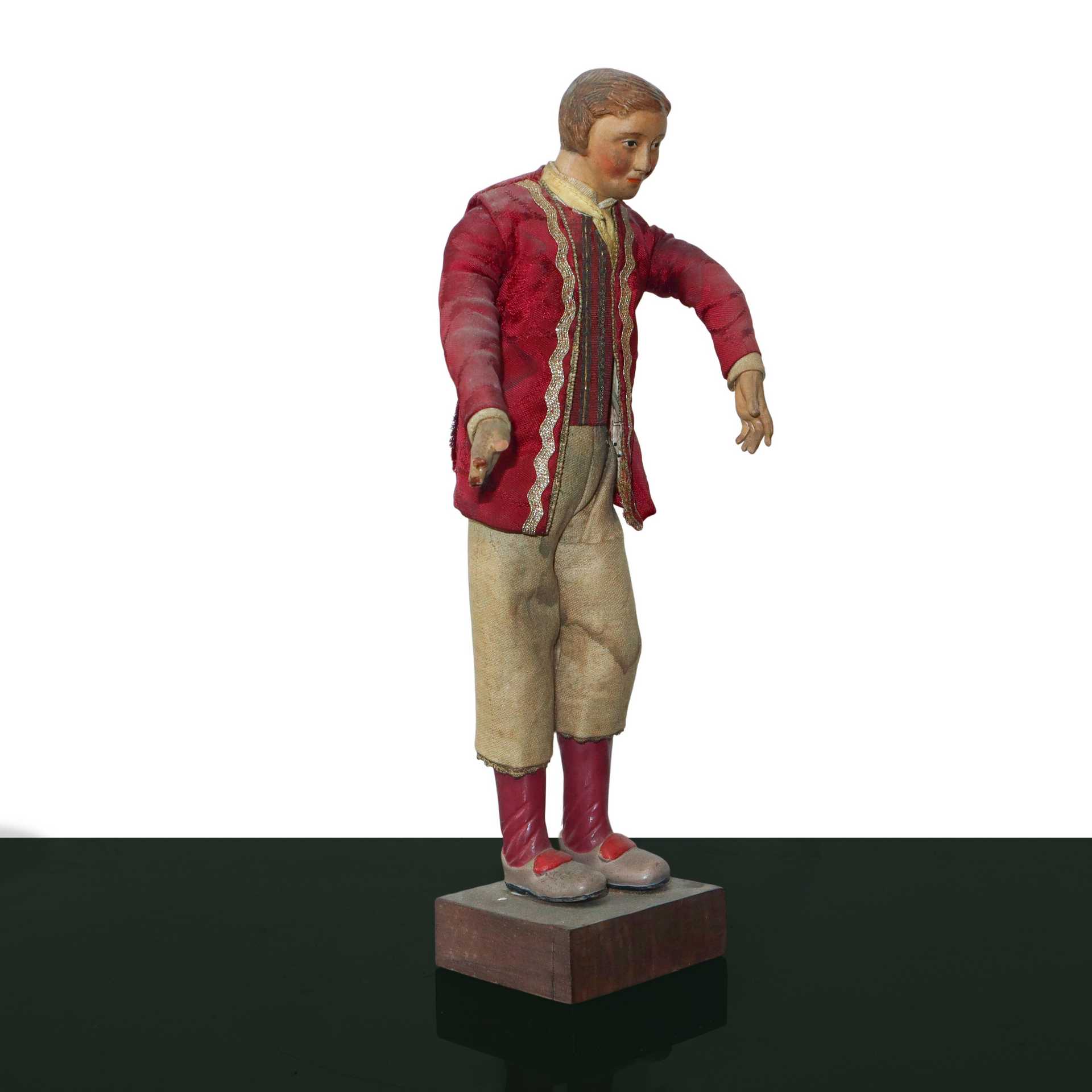 Lot 261 | Personaggio presepiale in terracotta e legno con vesti in cotone, raso e passamaneria: giovane nobile, Naples 19° secolo