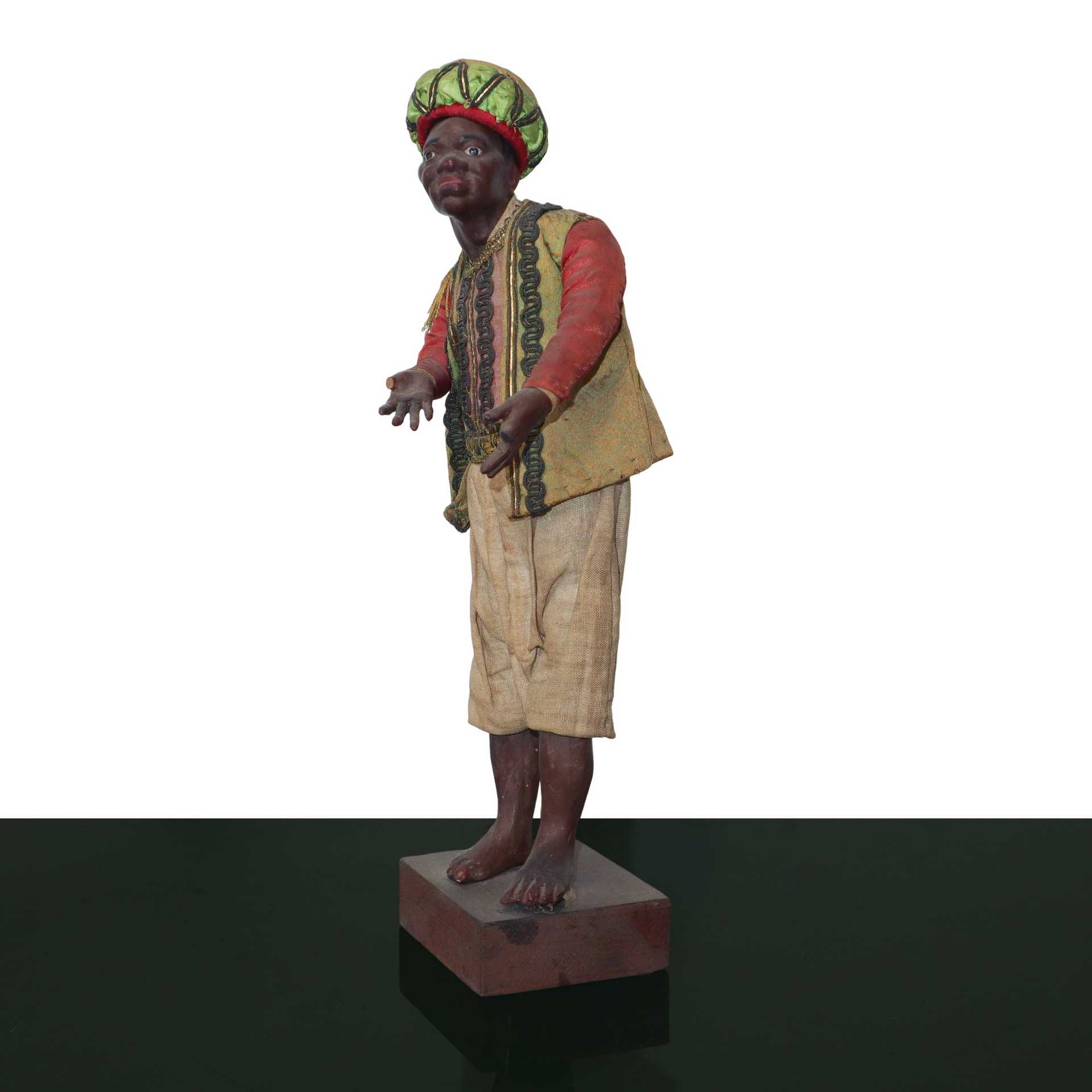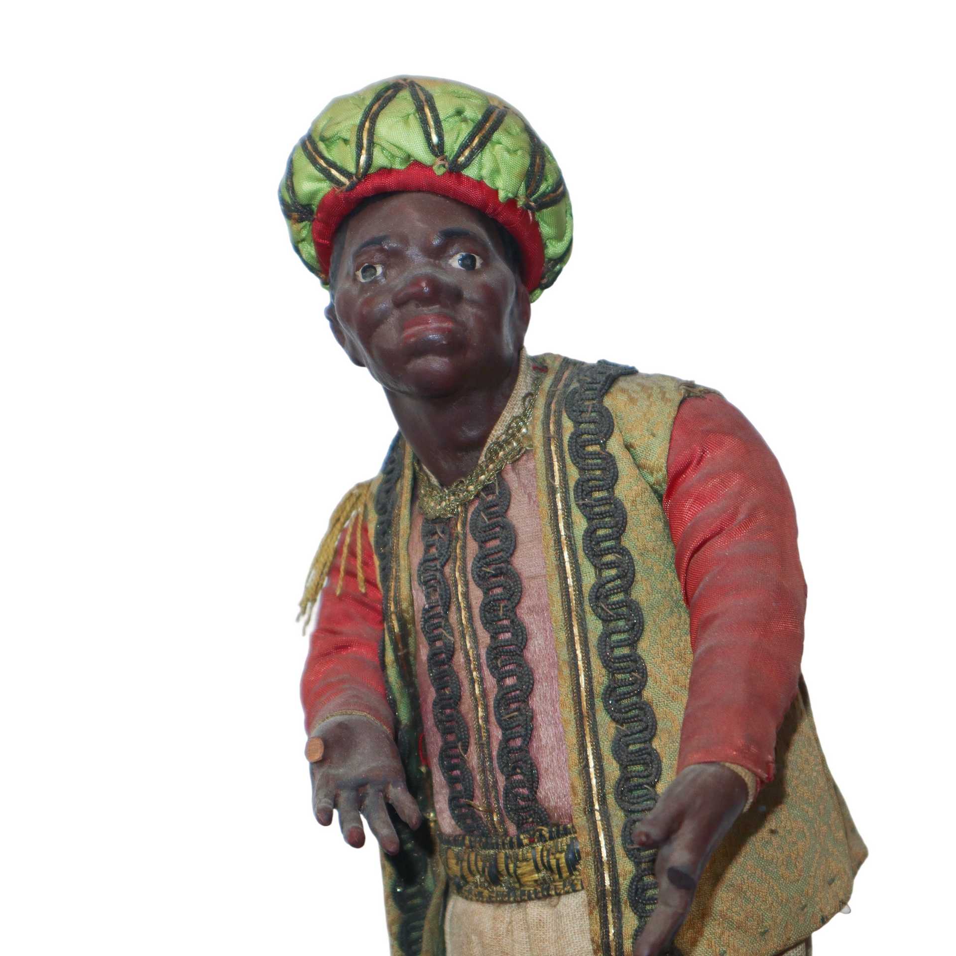 Personaggio presepiale in terracotta e legno con vesti in cotone, raso e passamaneria: servitore moro con turbante , Naples 19° secolo