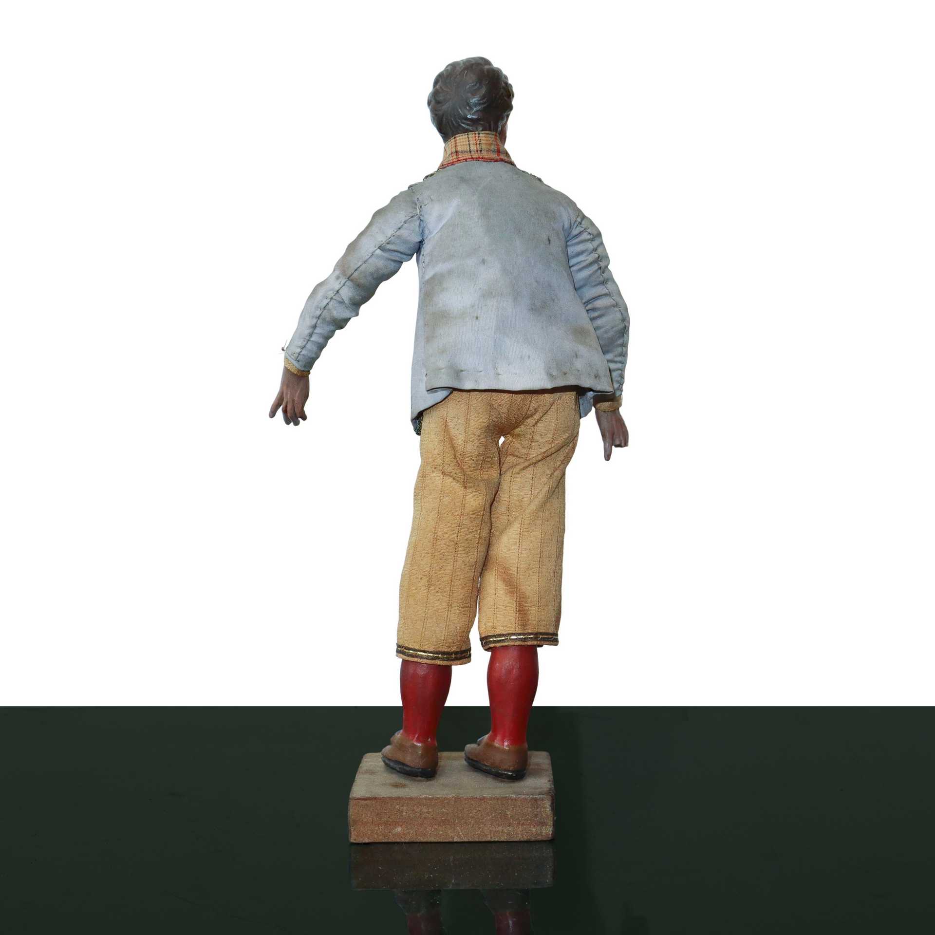 Personaggio presepiale in terracotta e legno con vesti in cotone, raso e passamaneria: popolano con baffi, Naples 19° secolo