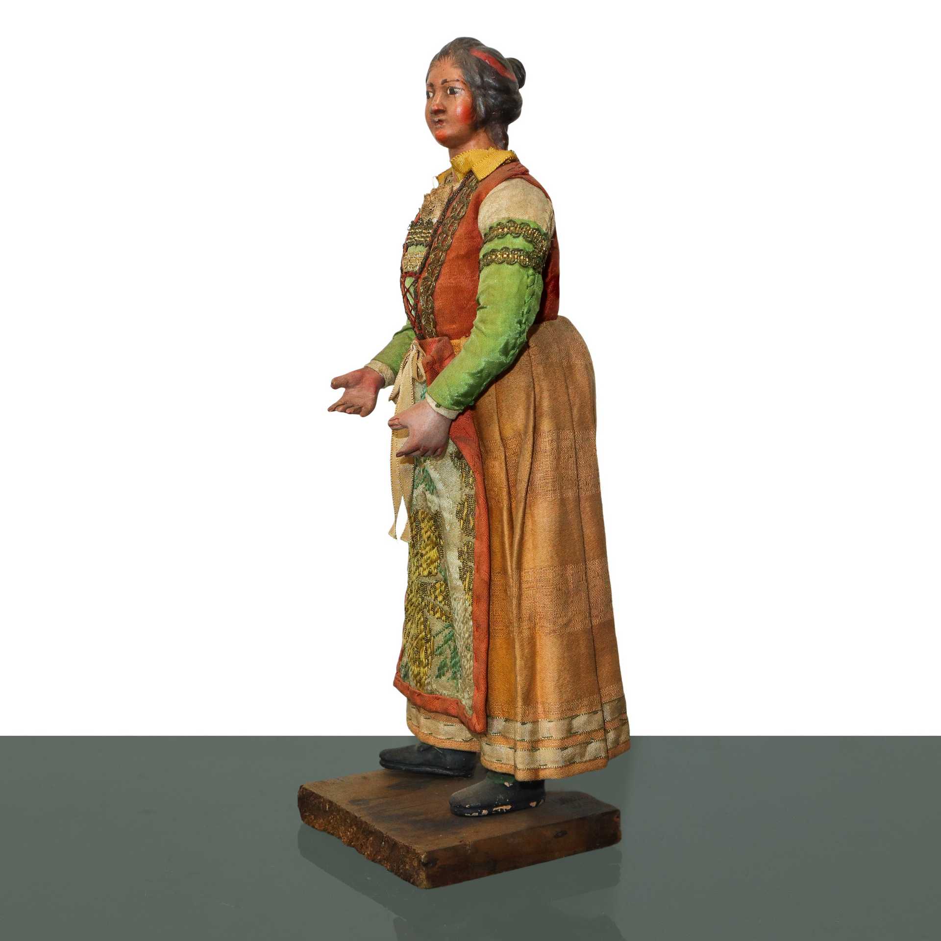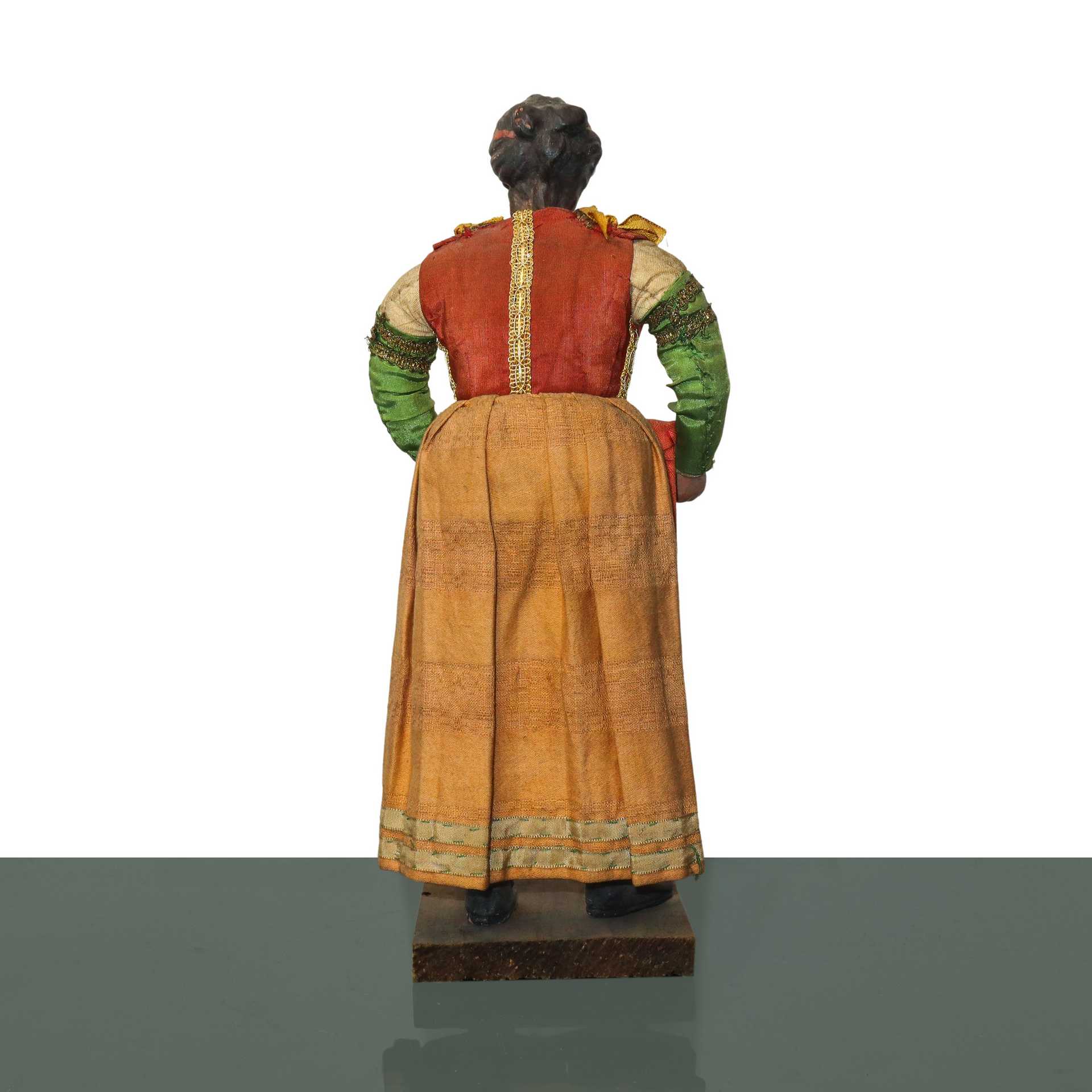 Personaggio presepiale in terracotta e legno con vesti in cotone, raso e passamaneria: popolana con grembiule , Naples 19° secolo