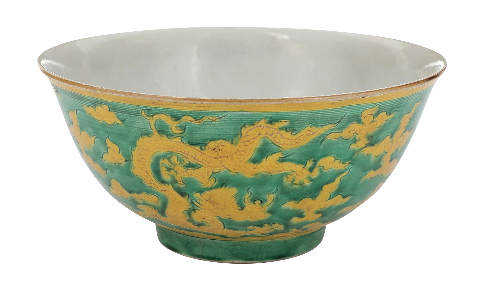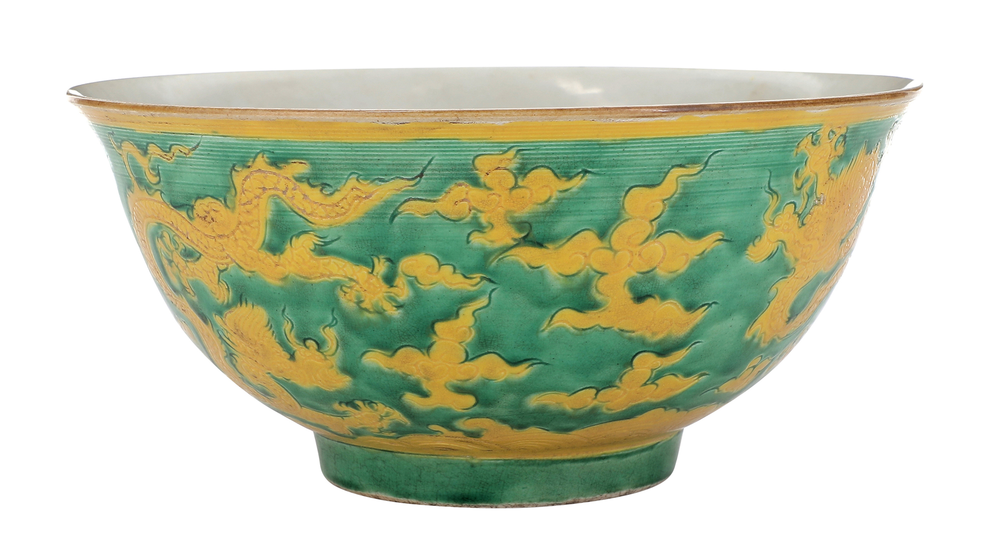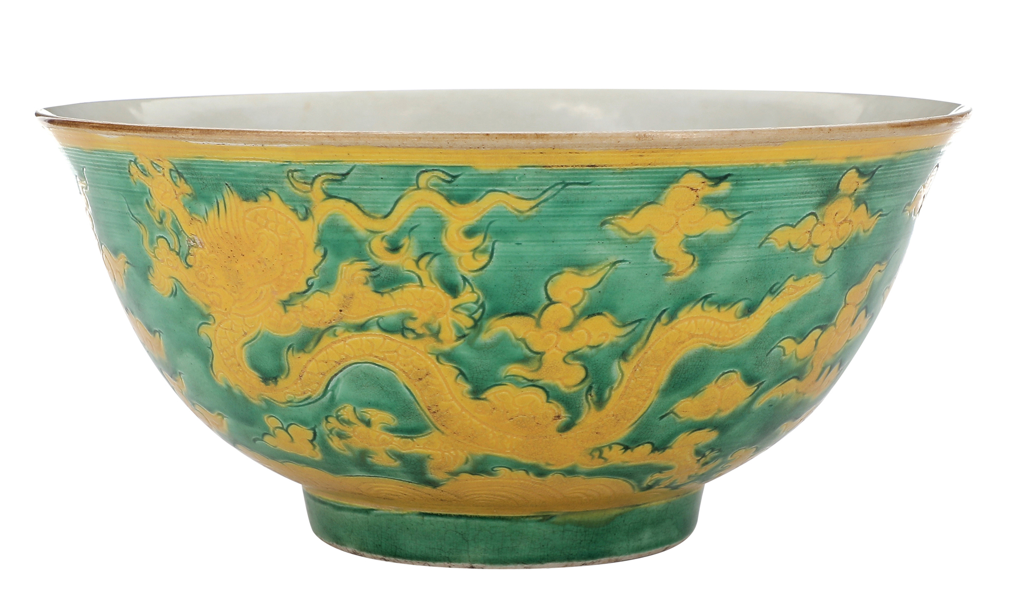 Porcellana invetriata, incisa e dipinta in giallo e verde