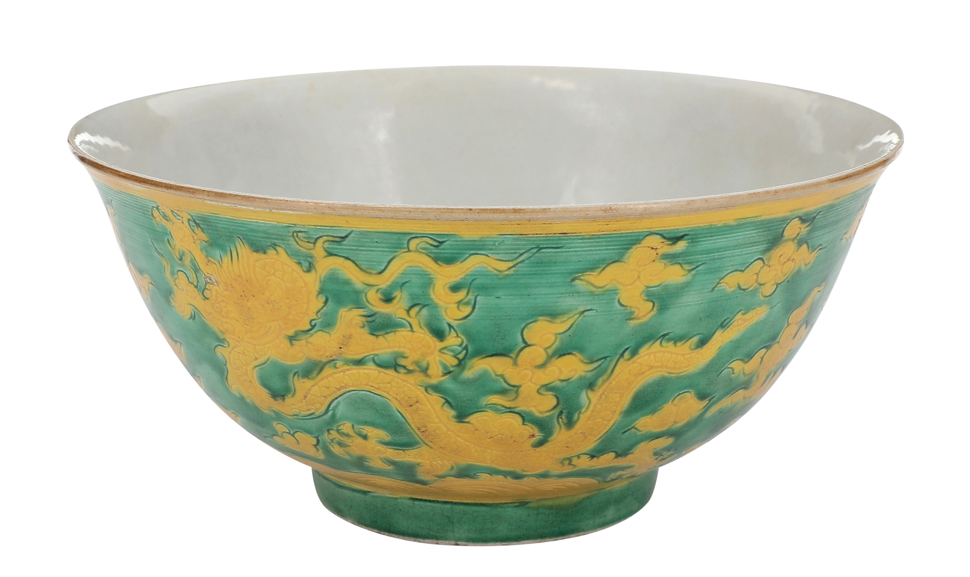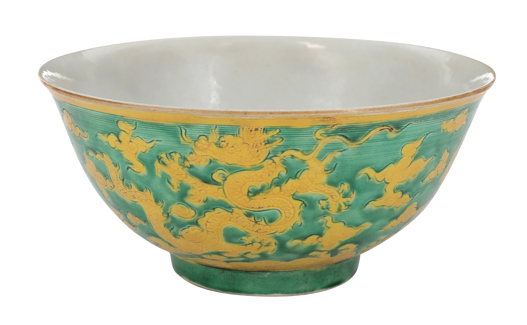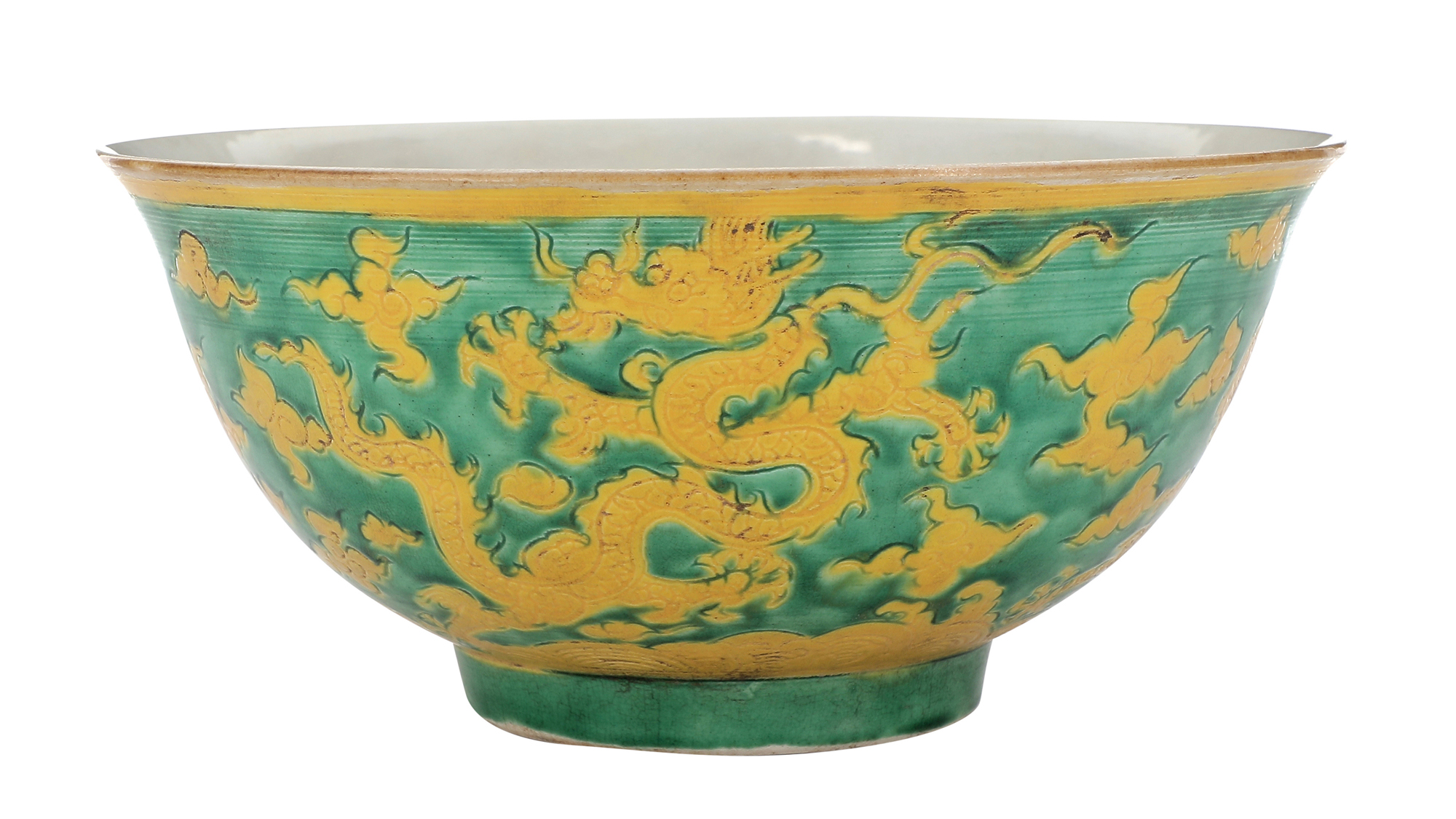 Porcellana invetriata, incisa e dipinta in giallo e verde