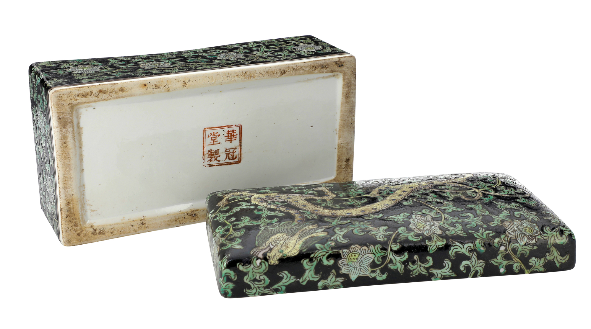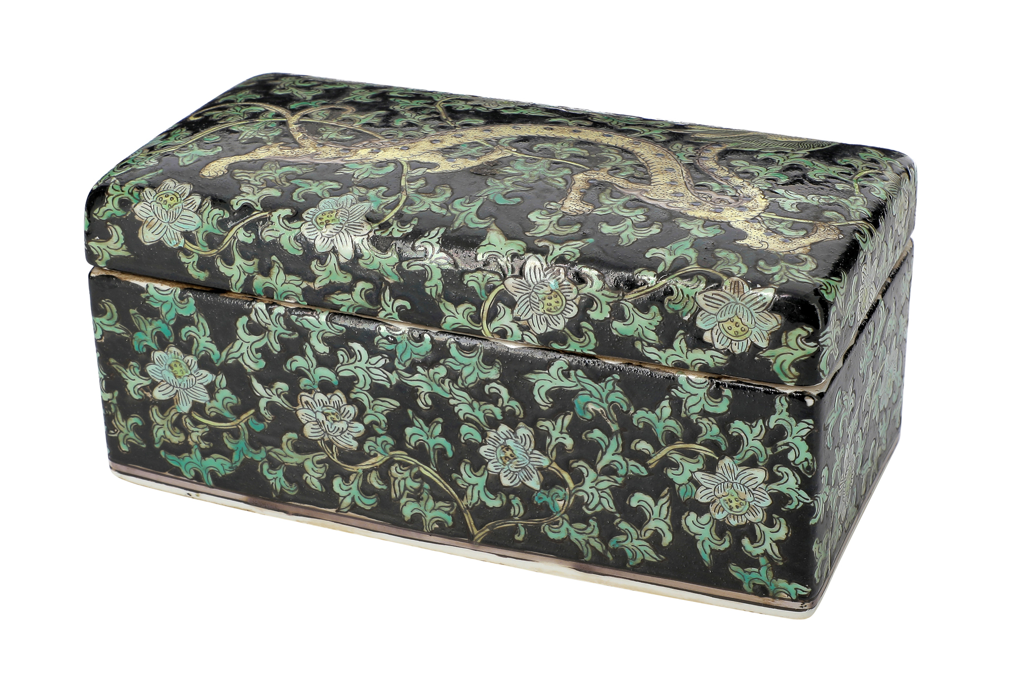 Cofanetto con coperchio con decoro di drago tra fiori di loto