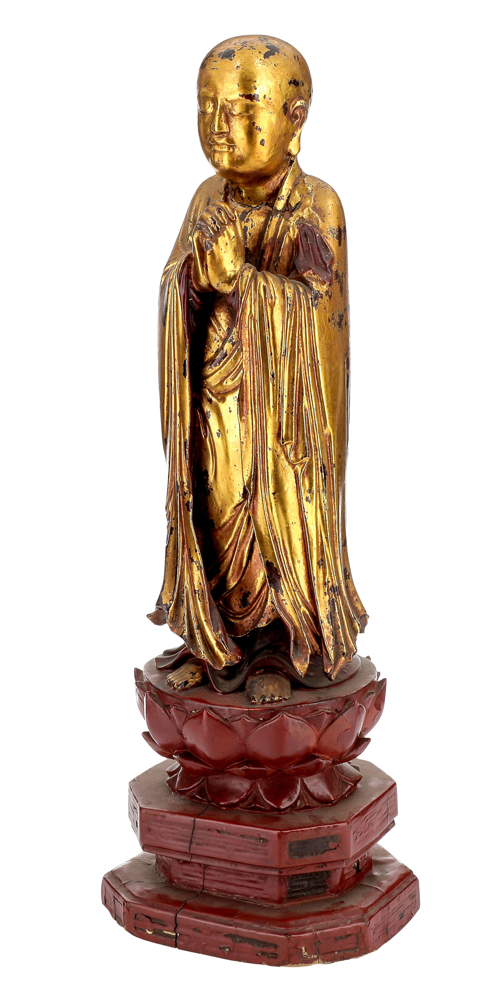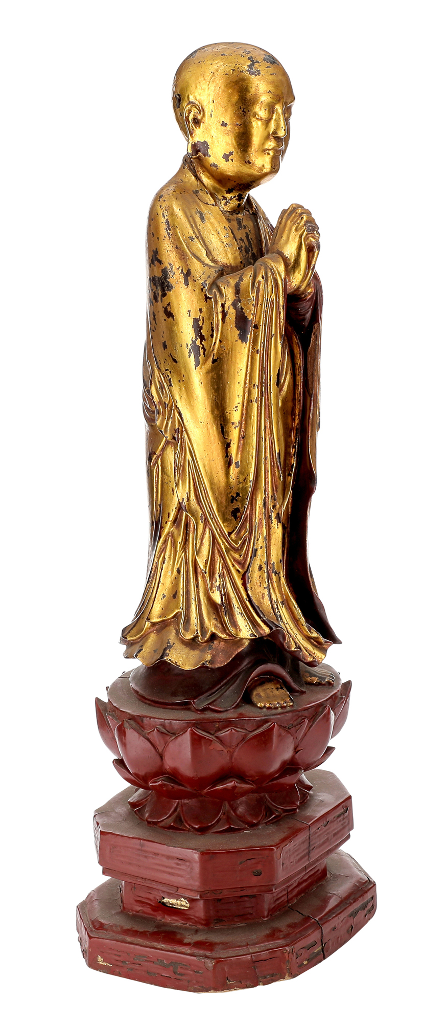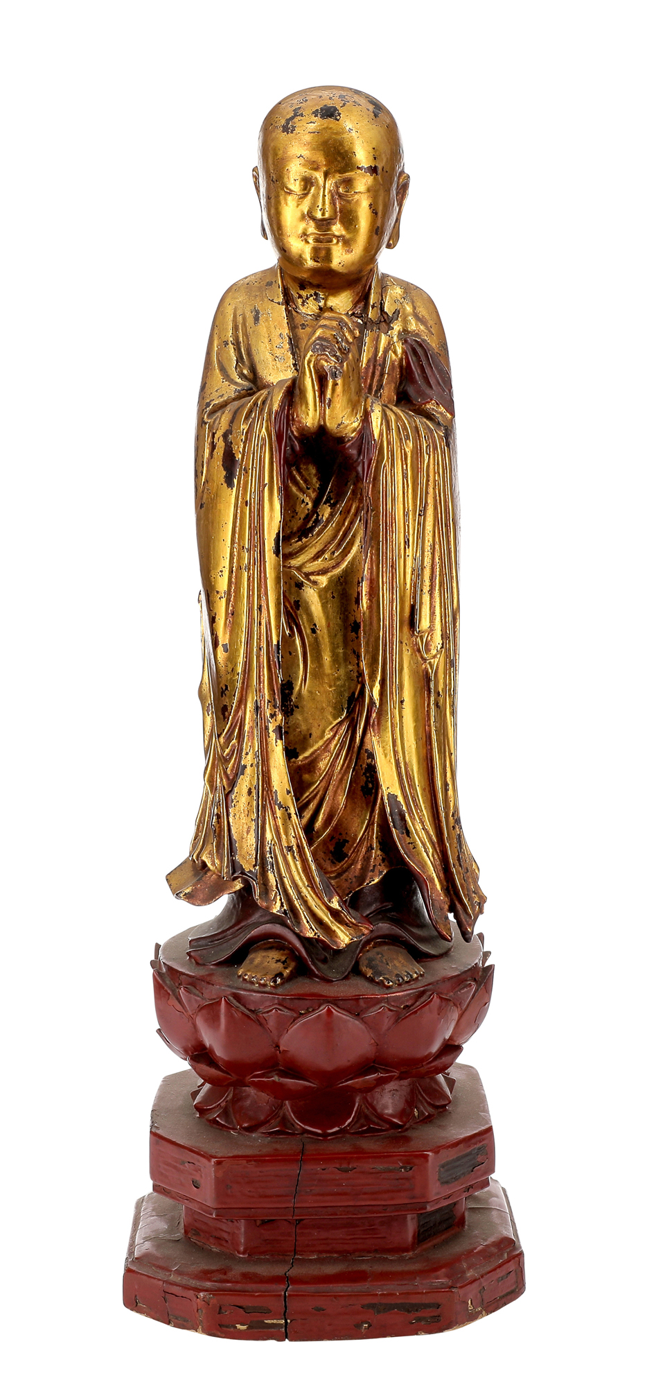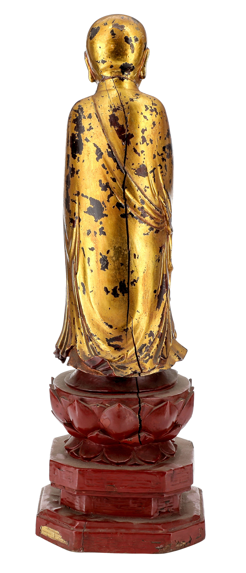 Il basamento, attualmente rivestito di lacca rossa, mostra tracce di sottostanti dorature.
