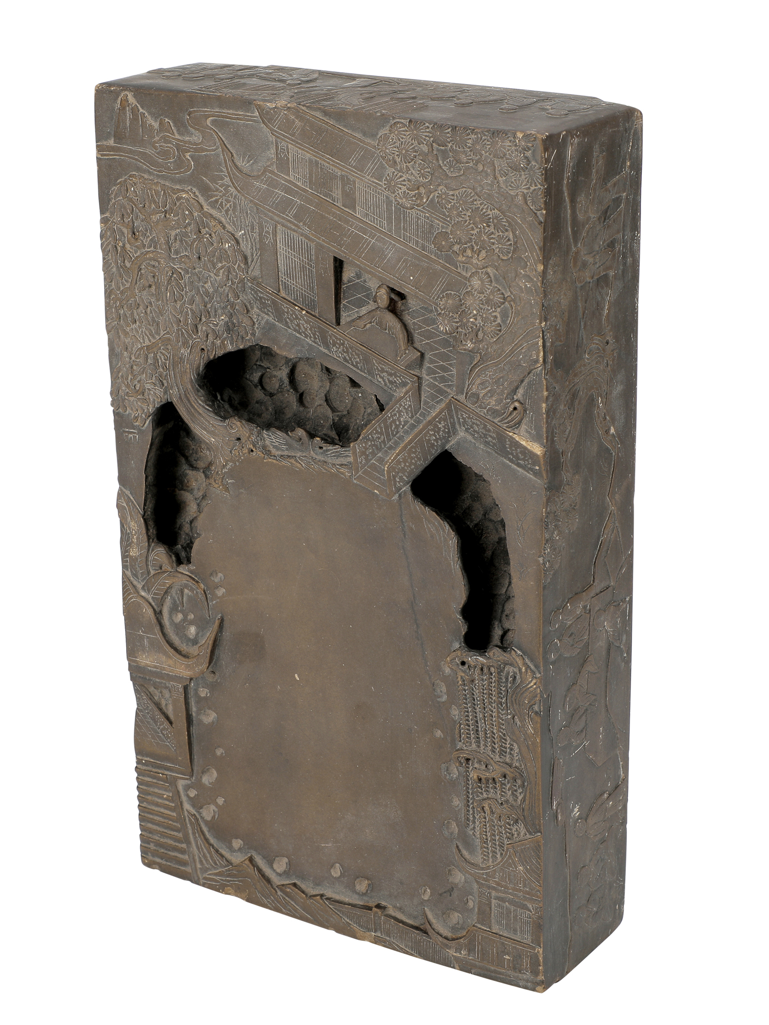 La bella pietra da studio, di peso inusitato perché possa essere essere trasportata, è illustrata da scene di incontri tra letterati nel paesaggio. In prima facciata, contenuta tra elementi architettonici, si vede probabilmente il proprietario, al banco di lavoro, con unione dell’elemento umano e di quello naturale, grazie ad una scala che porta al lago in cui egli deporrà l’inchiostro. Sui lati, scene di letterati nel paesaggio in maggiore o minore distanza e sul verso una lunga composizione in caratteri, di tema colto, chiusa da sigillo.
