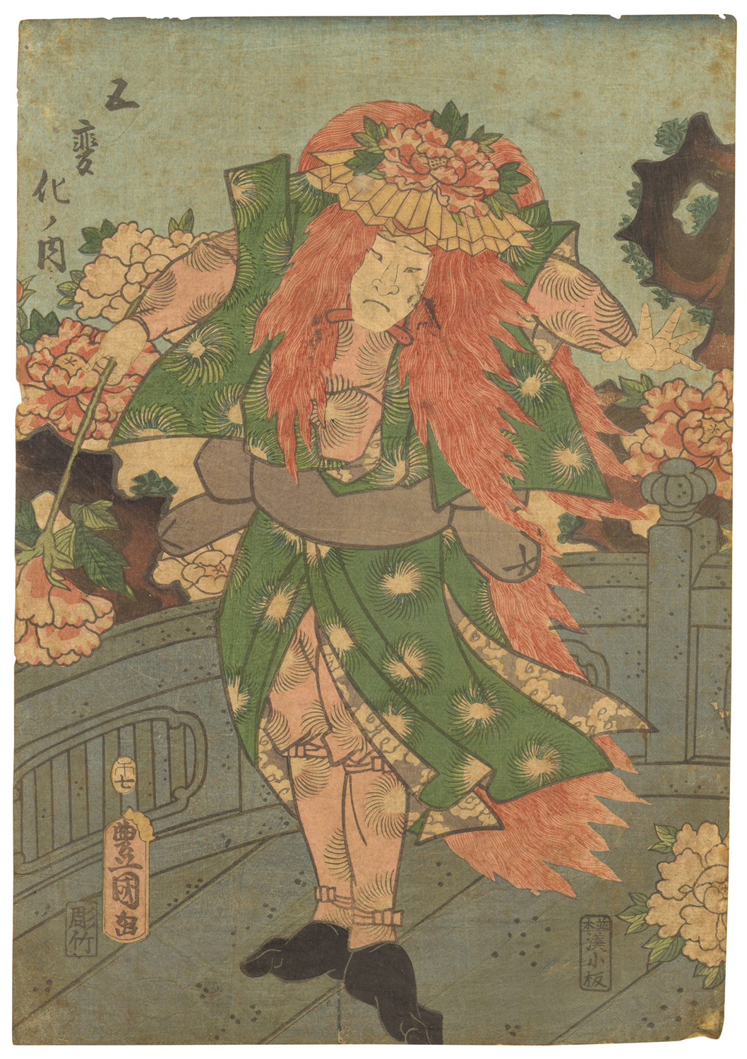 La stampa appartiene alla serie "Go-henge no uchi" (Cinque Metamorfosi) e rappresenta un attore Kabuki durante uno Shakkyō. Si tratta di un famoso dramma Nô, che narra la storia di un aristocratico giapponese che sceglie di recarsi in Cina, presso la tomba di Monju Bosatsu, un discepolo di Buddha di solito raffigurato mentre cavalca o guida al guinzaglio una creatura simile a un leone. Per tali ragioni, durante la rappresentazione vengono inscenate delle danze frenetiche e ritmate ("danze del leone") e gli attori indossano una parrucca rossa, simile a una criniera.