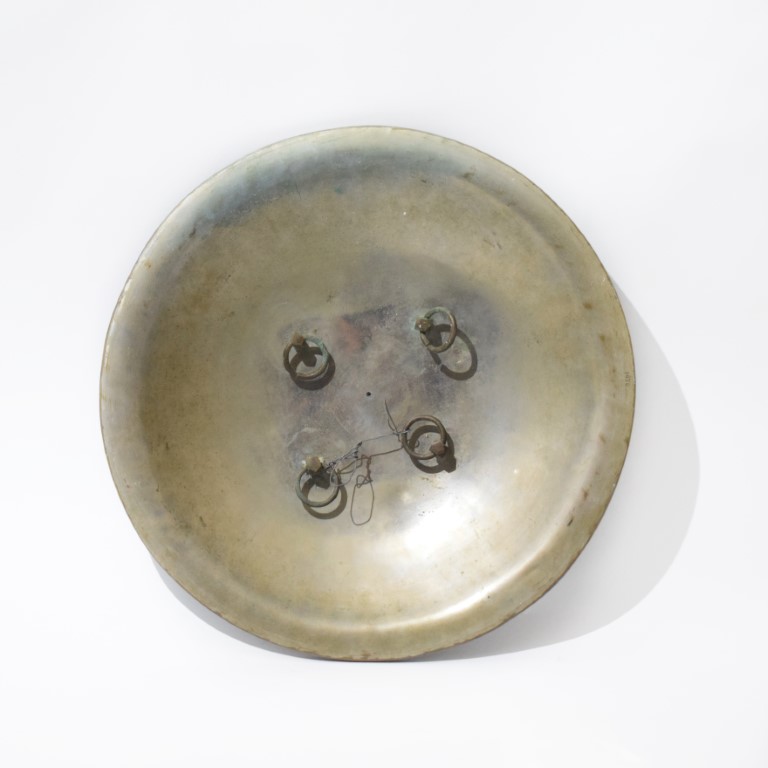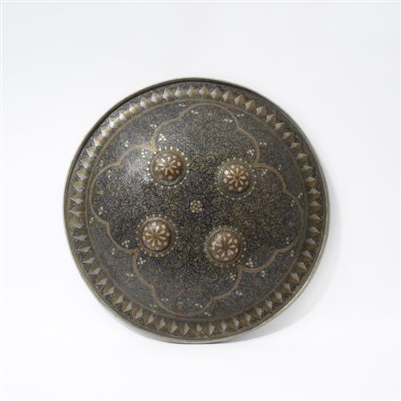 A large sized buckler of strongly convex shape with four hemispherical bosses. The exterior decorated with niello and floral scrolls.