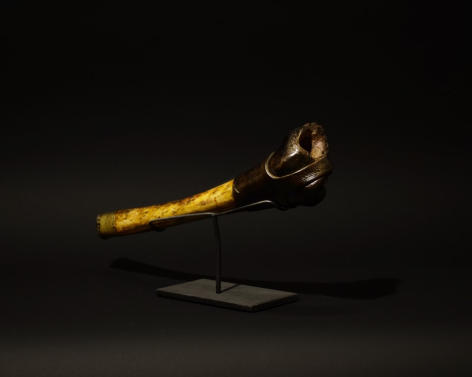 An ancient wind instrument made from a femur adorned with hand-stitched leather and a brass terminal. The Kangling was used in Tibet during tantric rituals. According to tradition, the music of this instrument was believed to drive away evil spirits and demons. In Buddhist symbolism, the sound of the Kangling was likened to the recitation of mantras.