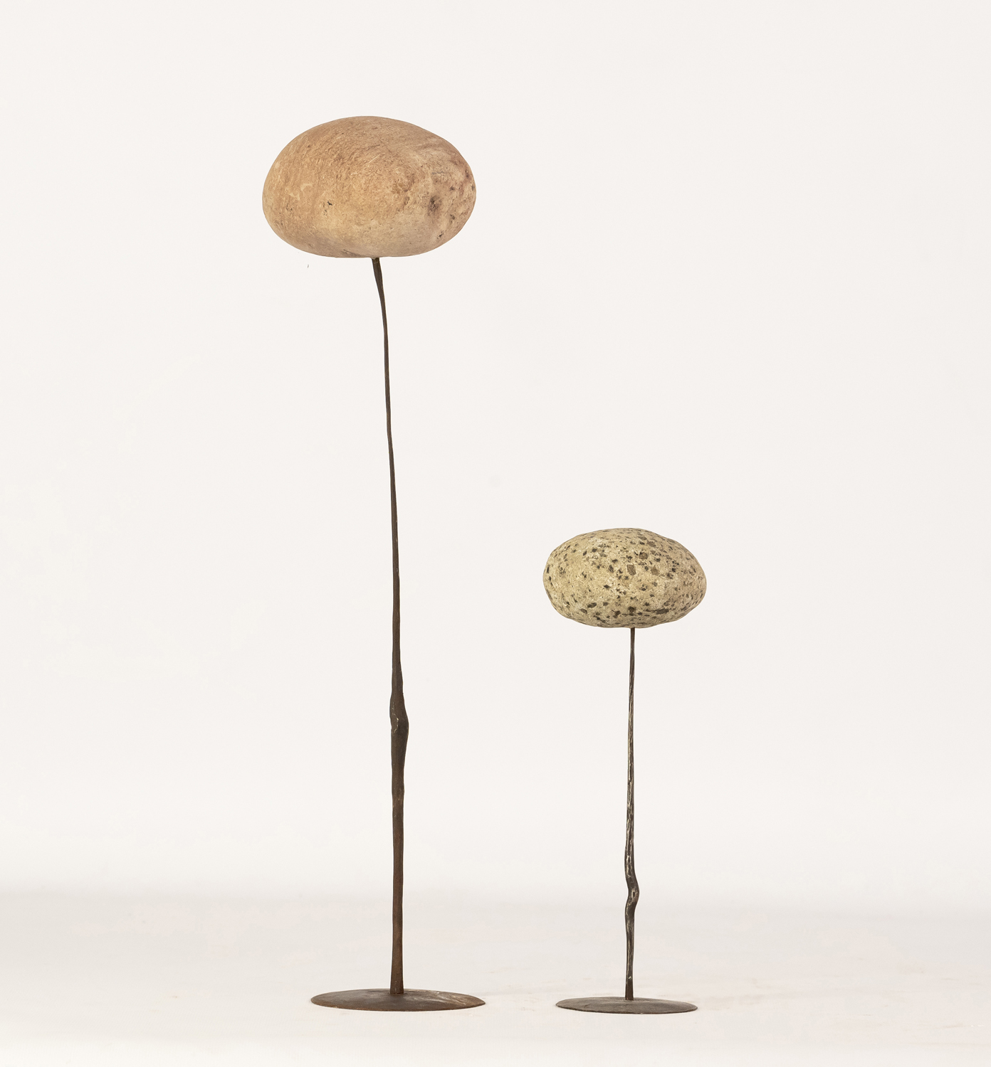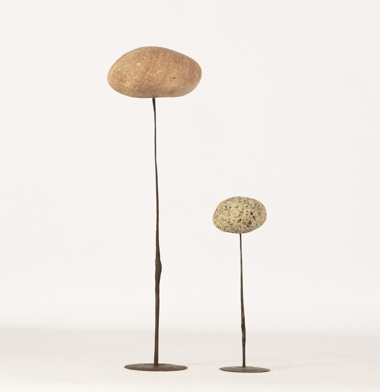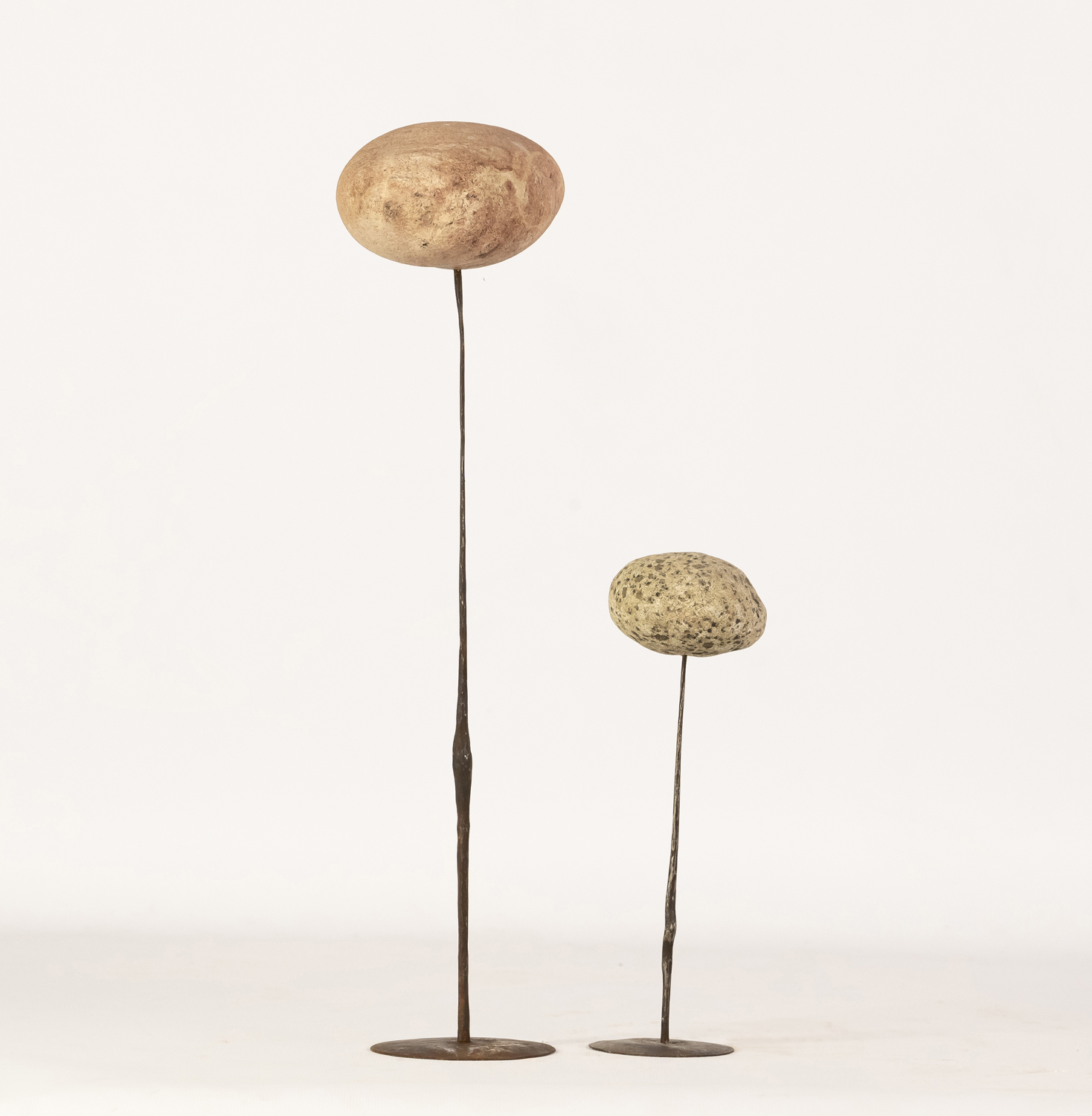 In diversi lavori, Benetton impiegò i sassi del fiume Piave. L'artista era sempre interessato al significato delle strutture. Riflettendo sul rapporto tra scultura e basamento decise di invertire la formula: qui il ferro sostiene il sasso. La soluzione tecnica è di grande interesse anche perché conferisce movimento al sasso, cambiandone in questo senso lo status da statico a dinamico. Il gioco risulta raffinato anche dal punto di vista del calcolo per conseguire il bilanciamento e la stabilità dell'opera. Con il tempo il bilanciamento di uno dei due steli ha richiesto l'intervento di Giovanni Benetton, artista del ferro egli stesso e figlio dello scultore, per essere pienamente consolidata.