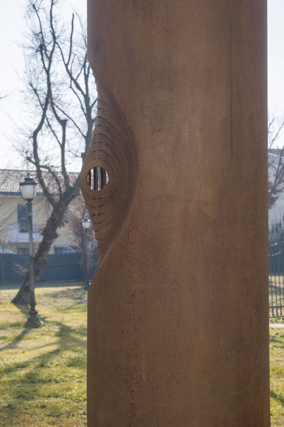 "La mia scultura intitolata 'Colonna' parte da un cilindro. Io, su questo cilindro, senza distruggerlo come forma geometrica, ho praticato dei tagli, dei fori, sono intervenuto secondo la mia idea artistica. Ebbene, quello non è più un cilindro, ma è pur sempre un cilindro; in realtà al suo interno, proprio per effetto di quei tagli e di quei fori, si è prodotto un fenomeno nuovo. La luce, entrando attraverso quelle fessure crea un gioco di ombre e figure che prima non esistevano e che mutano continuamente secondo le ore della giornata e l'inclinazione del sole. Non hai idea della grande meraviglia che ciò ha prodotto in me. È stata una scoperta emozionante. Pensa ora a quel cilindro in dimensioni enormi: la torre Eiffel, per esempio. E dentro scale per salire fino alla vetta. E pensa infine alle figure magiche, mutevoli, che si proiettano all'interno della sua superfice tonda. Ecco un esempio di scultura vivibile: quali emozioni riuscirebbe, una scultura del genere, a provocare nella gente? Quali fantasie riuscirebbe a suscitare un miracolo di luci elicoidali? Sono altrettante sculture mobili proiettate all'interno di una scultura, la 'Colonna'." (Franco Battacchi, testi di, "Toni Benetton. Il genio del ferro", Stia, 2000, p. 86).