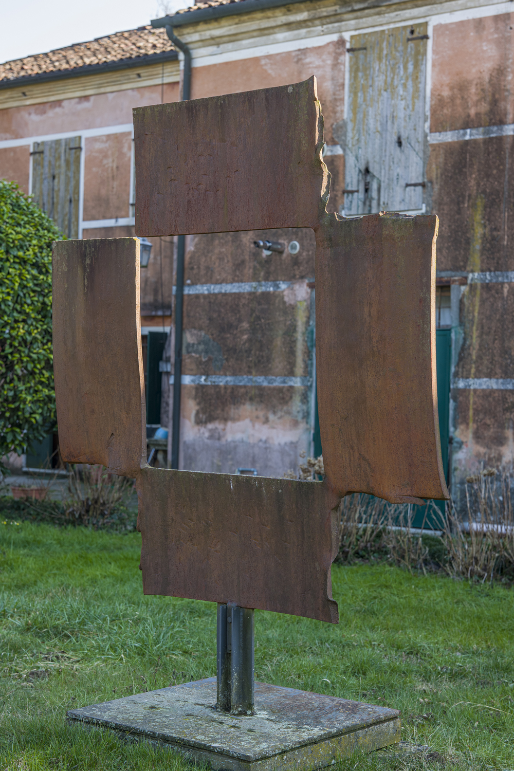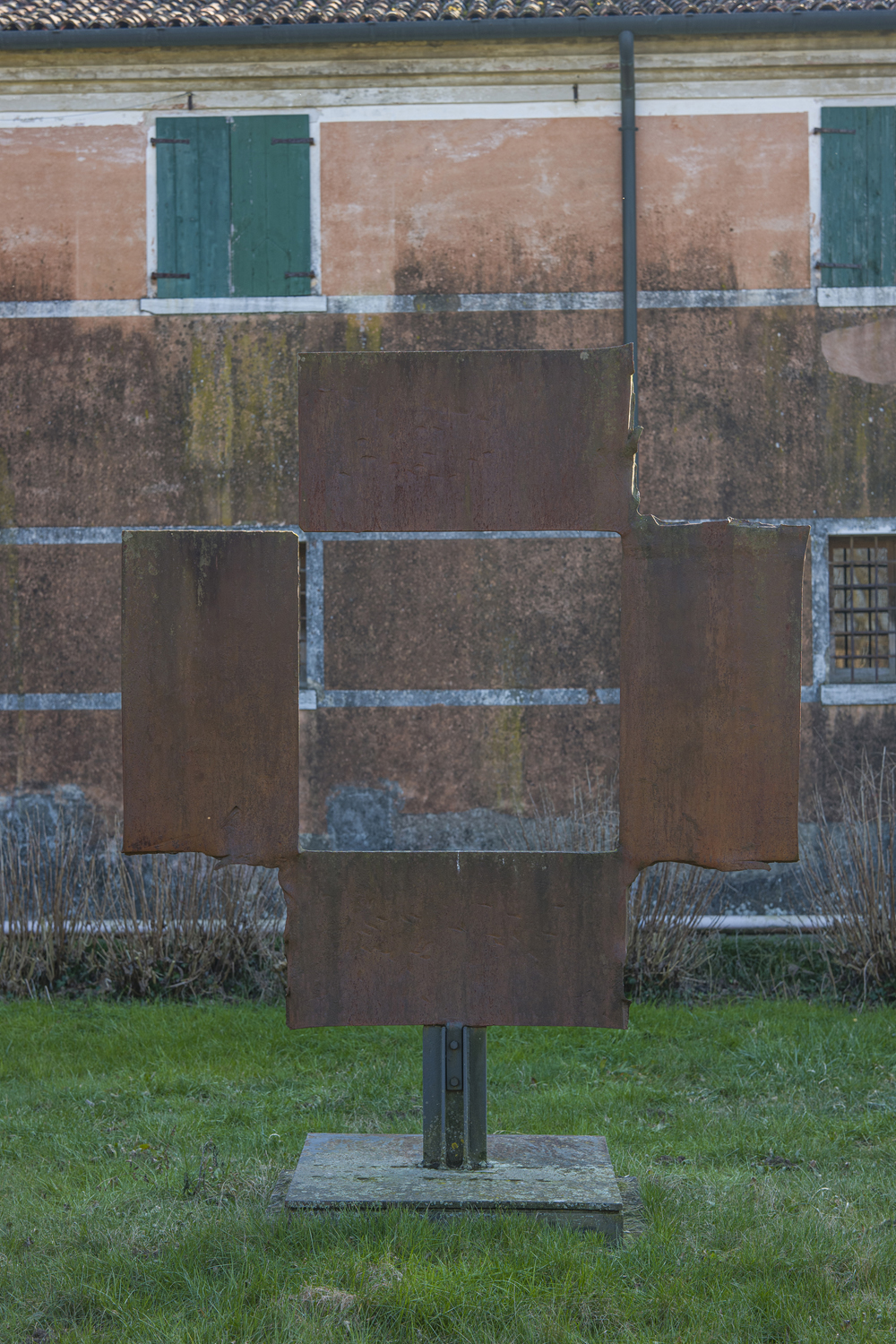Dopo essersi sperimentato nelle grandi sagome ispirate a figure umane e animali, Benetton si rese conto che nella dimensione monumentale le sue opere diventavano enormi masse scure. Decise così di utilizzare diversamente il rapporto tra vuoto e pieno, rendendo protagonista la luce all'interno della struttura metallica. In questa opera - una grande lastra tagliata in forgia a colpi di scalpello e ricomposta in modo non diverso, per esempio, dalle coeve "Persiane" di Tano Festa - Benetton prima incornicia la luce, creando un vero e proprio quadro in cui la scultura è assenza e presenza nello stesso tempo (ecco allora il parallelo con le sculture invisibili cui Gino De Dominicis lavora proprio dal 1968), e poi ne accentua la leggerezza lasciando aperto l’angolo superiore a sinistra. Il titolo - "Croce greca" - non risale a Benetton, ed in effetti è una pura suggestione derivante dalla visione dell'opera, e delle sue quattro braccia uguali con la luce al centro. L'opera non ha significato religioso ma è una riflessione sulla forma.