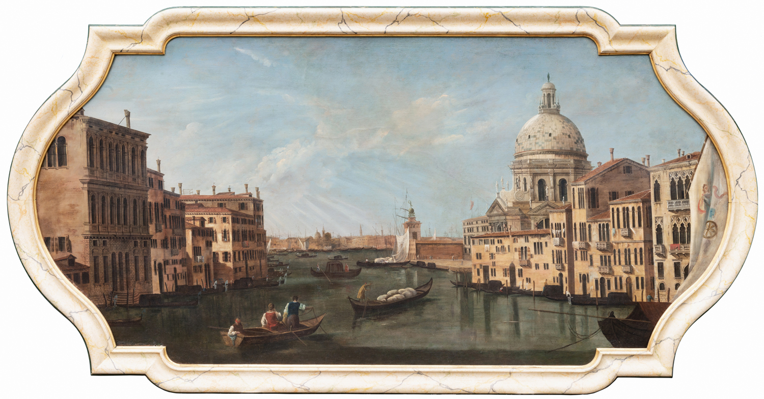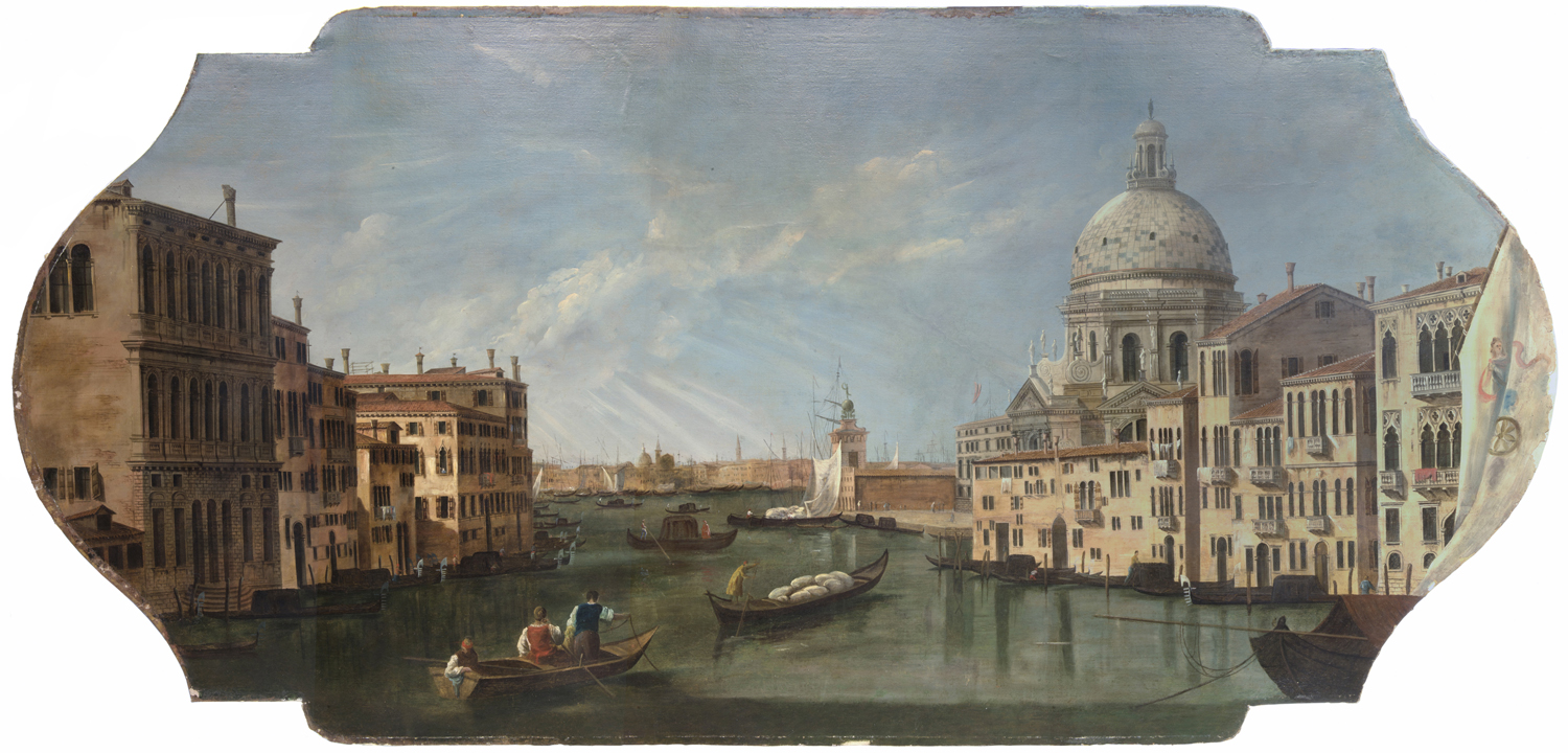 "Il Canal Grande con la Chiesa della Salute, Venezia" riprende il dipinto di Canaletto, ora nella collezione Alfred Taubmann, New York, documentato dal 1765 al 1783 nella casa di Giovanni Berzi a Padova, dove era pervenuto da Venezia probabilmente poco prima del 1760, assieme ad altre tele della stessa serie eseguita nel 1722-1723 per il pittore veneziano Antonio Pellegrini e ereditata dalla moglie, Angela Carriera (m. 1760), sorella della celebre pittrice pastellista Rosalba (nota 1); attorno al 1787 viene acquistato da John Strange (1732-1799), residente britannico a Venezia che lo mette in vendita all’incanto il 10 dicembre 1789 a 125 Pall Mall a Londra (lotto 71).