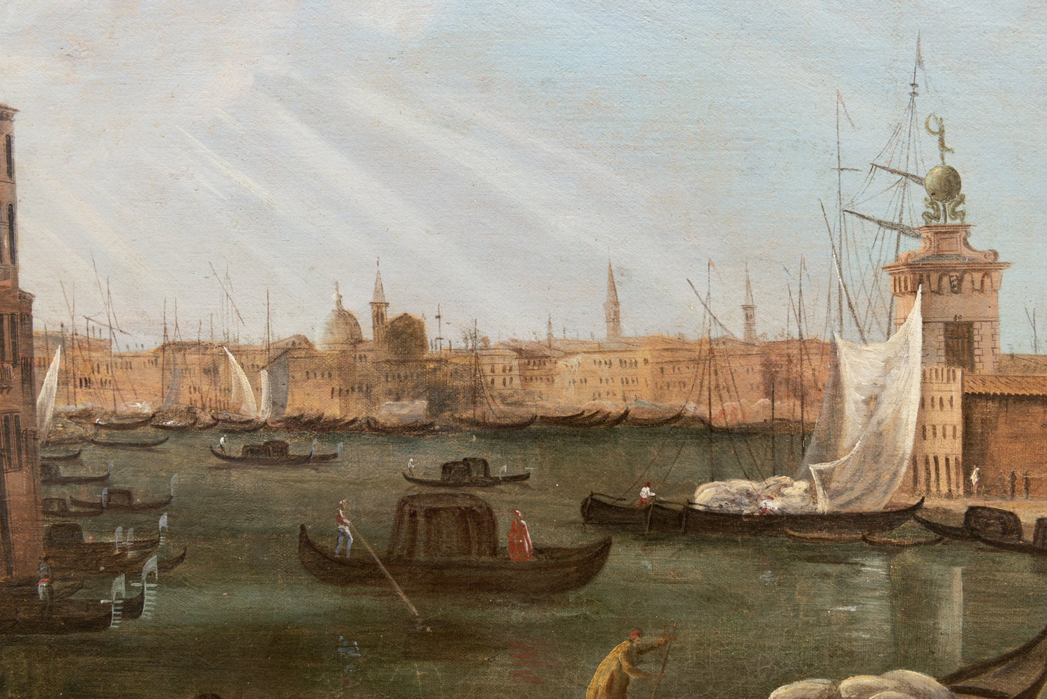 Queste due ampie vedute di Venezia [n.d.r. lotti 18-19], eseguite ad affresco, sono un unicum nella storia del vedutismo veneziano del Settecento. Le composizioni seguono le tele giovanili di Giovanni Antonio Canal, detto Canaletto (1697-1768), eseguite nel 1722-1723, raffigurando le architetture riprese dagli stessi punti di vista, riportando le stesse imbarcazioni e le figure, ma adottando la tecnica del Canaletto maturo, dei decenni successivi. La conoscenza diretta degli originali e nello stesso tempo delle opere più tarde di Canaletto induce a credere l’autore appartenente alla sua stretta cerchia, forse collaboratore nello studio. La Torre dell’Orologio nel Bacino di San Marco dalla Giudecca, Venezia, si presenta completa di secondo piano, indicando una data posteriore ai lavori di sistemazione e rimodernamento intrapresi secondo il progetto dell’architetto Giorgio Massari nel 1755. Il termine ante quem è il 1787, quando inizia la dispersione delle opere di Canaletto.
