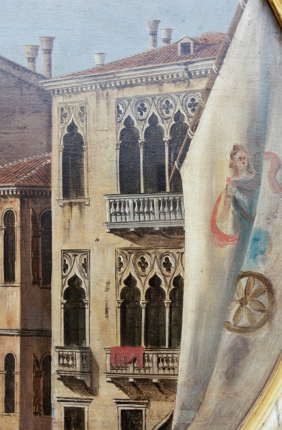 Il presente lotto e il successivo costituivano il pendant decorativo del salone del settecentesco palazzo Colonna Preti a Castelfranco Veneto - che ancora conserva gli originari apparati di stucco che incorniciavano le vedute - da cui furono asportati prima del 1935, data in cui è annotato un primo intervento di restauro nei registri della Banca Popolare di Asolo e Montebelluna «dei due quadri acquistati dal Co. Rinaldi, ed attribuiti a scolari del Canaletto». Per primo Giuseppe Pavanello ha confermato sul piano stilistico la afferenza degli affreschi al '700 veneziano (comunicazione del 28 maggio 2021), già indicata conseguentemente all'esame materiale dei manufatti dall'esperto restauratore Giuseppe M. Dinetto (nota del 27 aprile 1994). Charles Beddington, su base fotografica, ha segnalato il rapporto tra le due opere e due vedute di Canaletto databili intorno al 1722, delle quali la prima, rimasta a Venezia almeno fino agli anni quaranta del Settecento, è oggi conservata nella Alfred Taubmann Collection, New York, e la seconda presso il National Museum of Wales, Cardiff. Data la adesione anche cromatica ai modelli canalettiani, Charles Beddington ritiene possibile che si tratti di un autore vicino a Canaletto forse attivo già negli anni venti del Settecento (comunicazione dell'11 giugno 2021).