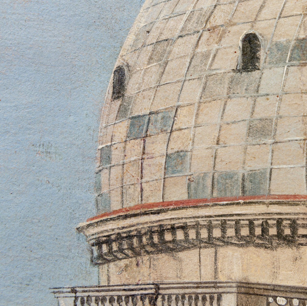 W. G. Constable, il primo grande studioso di Canaletto, considerando la sua conoscenza dei procedimenti di Canaletto, riconosciuta già dai contemporanei, lo crede allievo e forse collaboratore del Maestro. Giuseppe Moretti è anche unico vedutista-prospettico a sperimentare la tecnica dell’affresco - nel 1780 lo vediamo nel ruolo di quadraturista della volta della navata nella chiesa di San Tomà a Venezia, in fianco a Jacopo Guarana (nota 15) - potrebbe essere lui l’autore delle due opere qui in esame, come sembrano confermare anche le sagome squadrate delle figure.