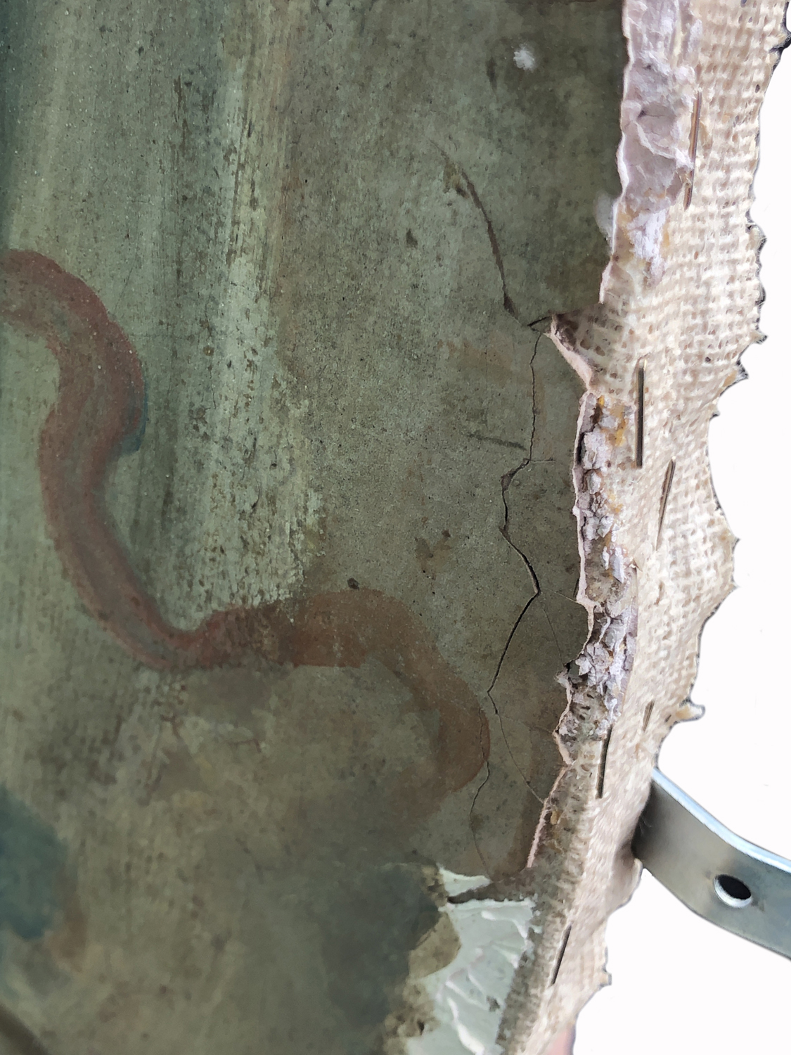 Stato di conservazione. Supporto: 60% (affresco strappato, riportato su foderatura a doppia tela)