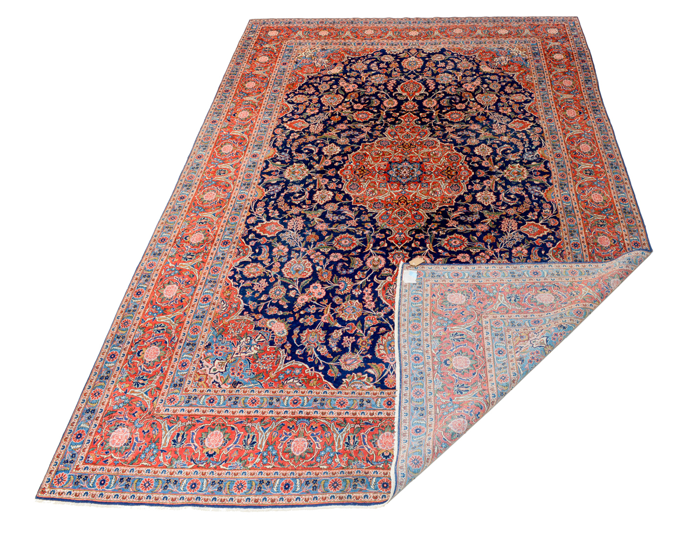 Classico esemplare con piccolo medaglione allungato in rosso, contenente al centro una stella azzurra, con due pendenti, appoggiato sul campo di colore blu riccamente decorato con motivi floreali. Bordura a fondo rosso, con tipiche rose di Kashan, alternate a foglie biforcute.