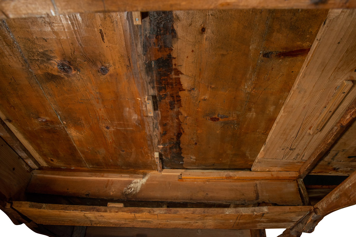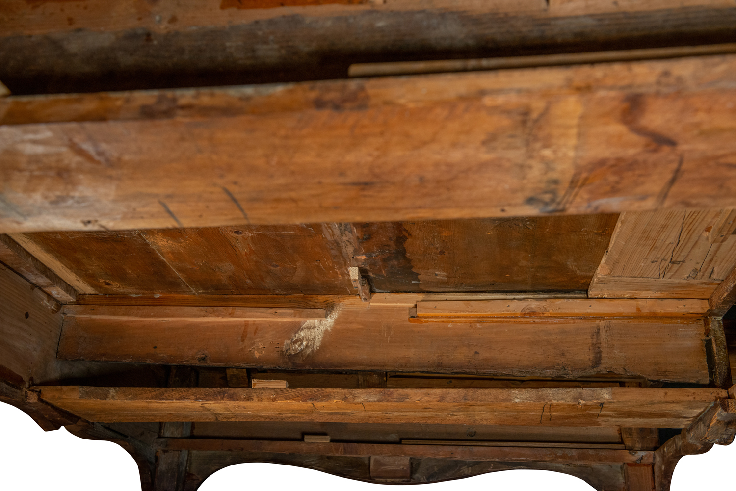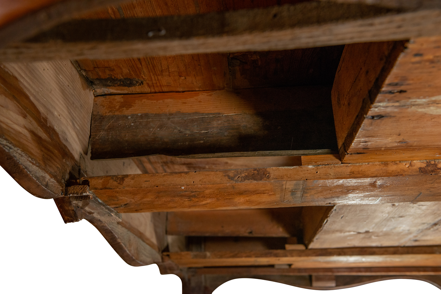 Il corpo del mobile segue forme venete, ed in particolare vicentine, del terzo quarto del XVIII secolo, completate con una bella impiallacciatura, realizzata con cartelle antiche.