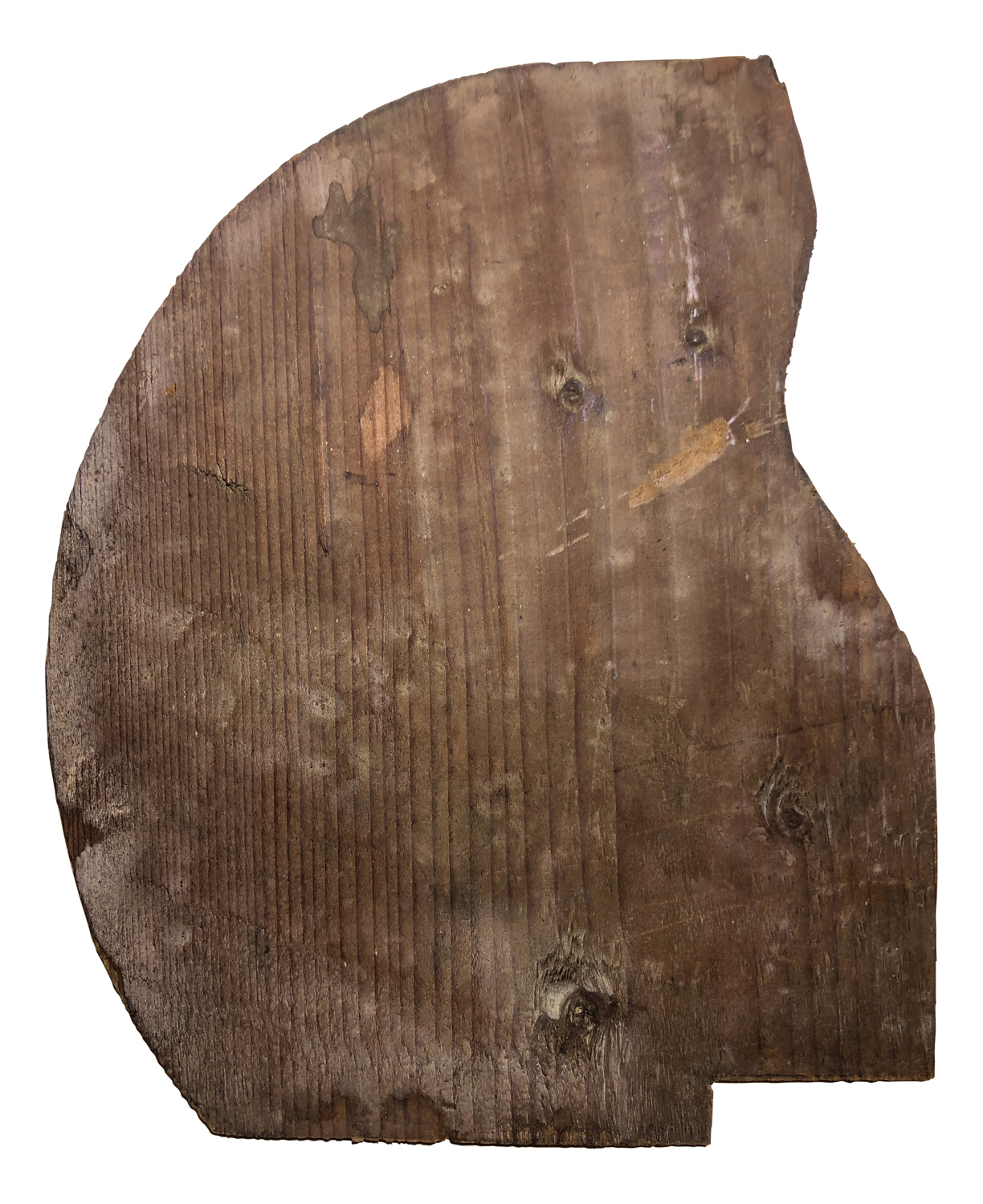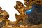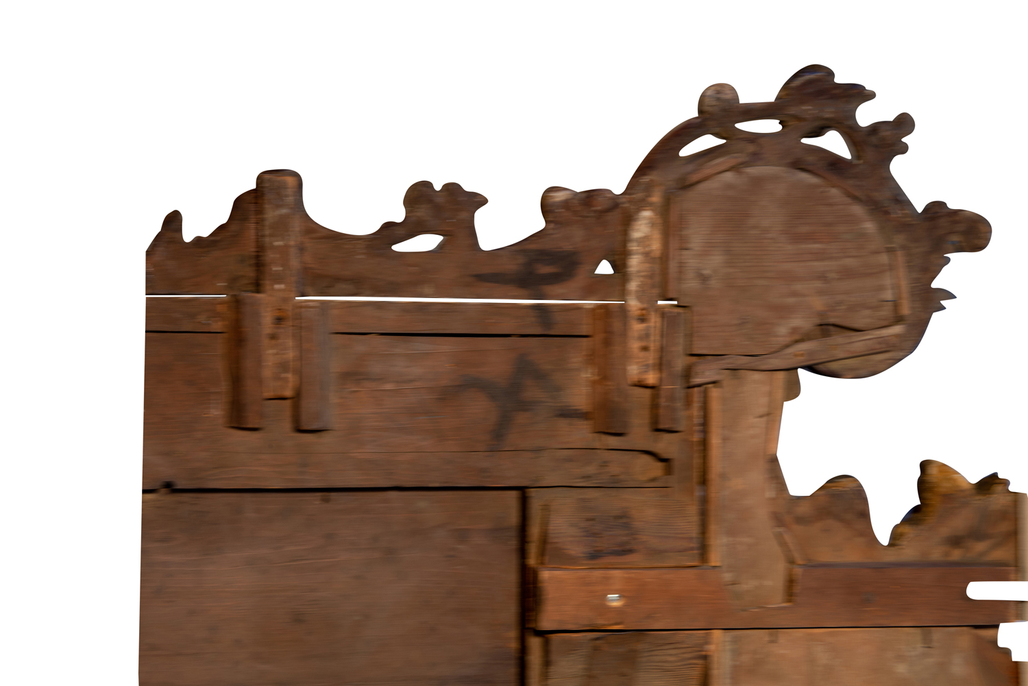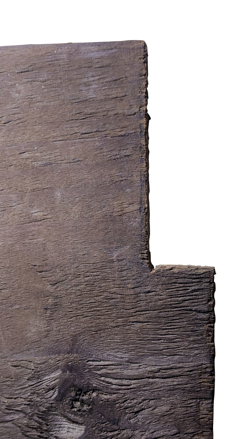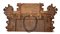 Stato di conservazione. Supporto: 80% (schienale del vetro centrale sostituito; fregi laterali e fregio inferiore fissati con viti moderne e con specchi e fondini aggiunti; fratture per esempio sulle figure e sul cimiero: danni da urto localizzati)
