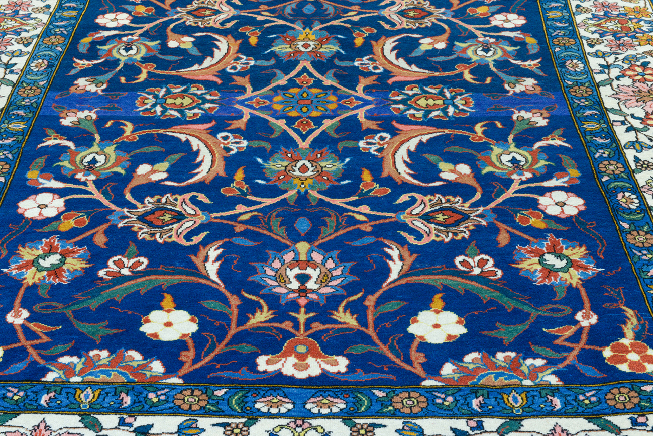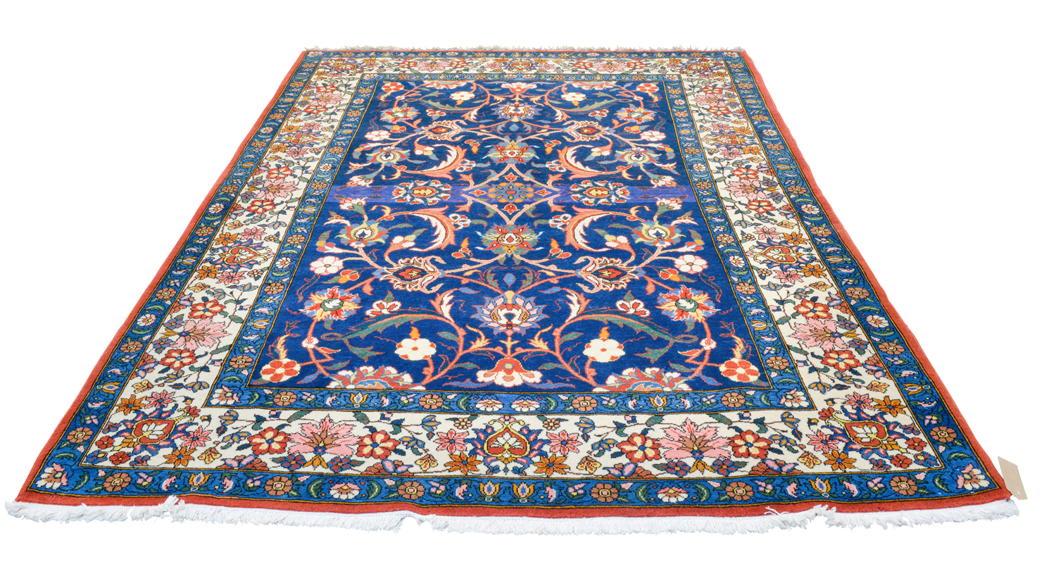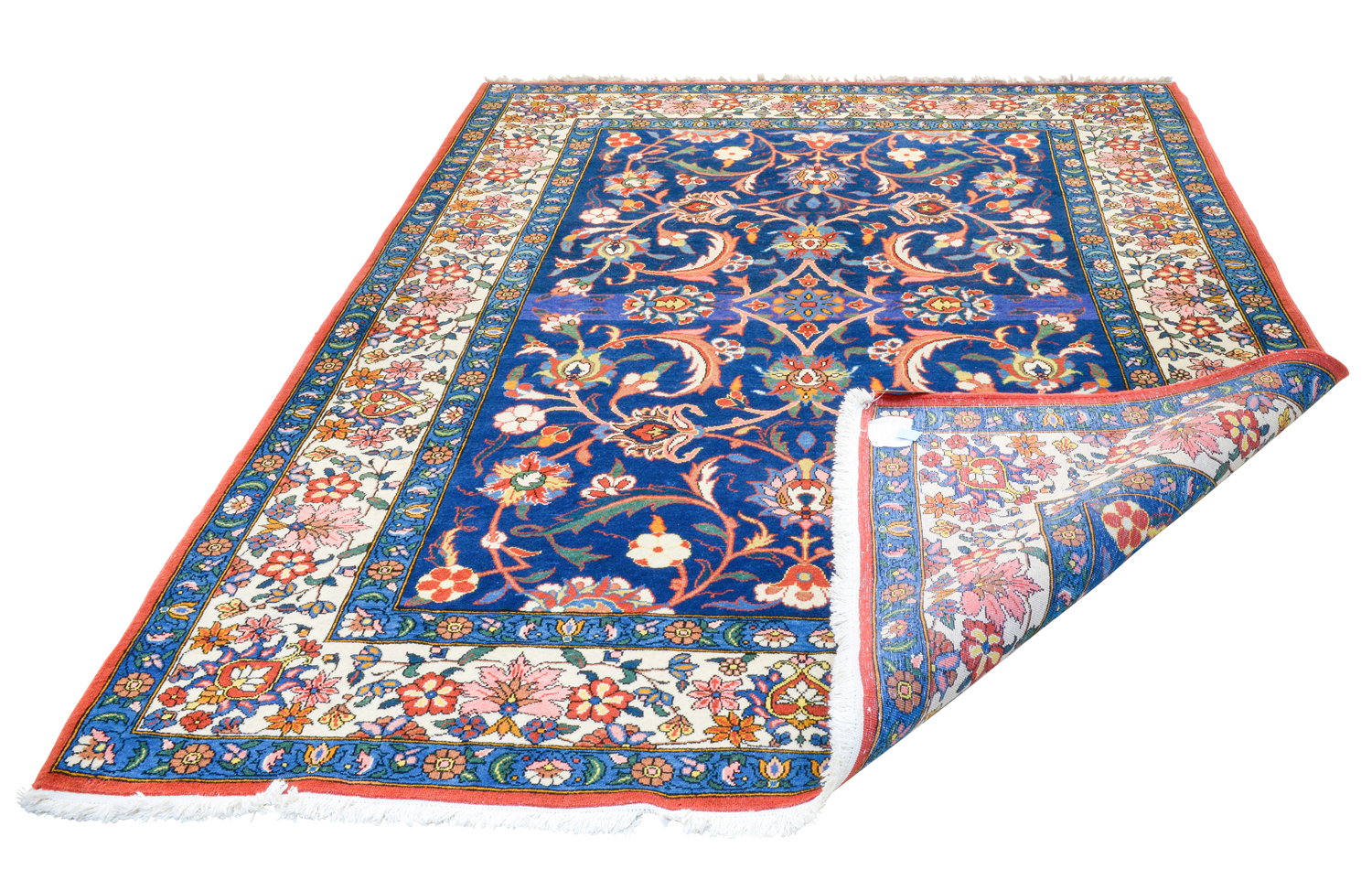 Campo, a fondo blu scurissimo, contraddistinto da un motivo herati, ingrandito di scala: al centro una rosetta racchiusa entro una losanga, circondata da quattro foglie arcuate, molto ben disegnate.