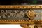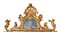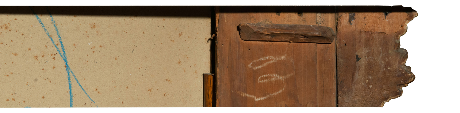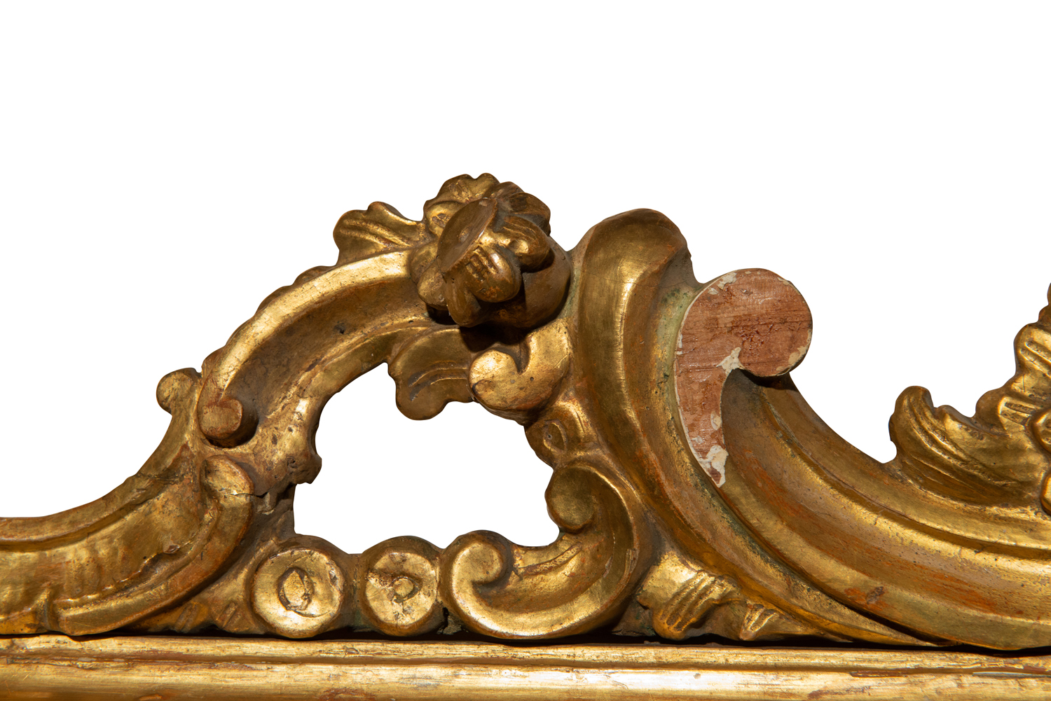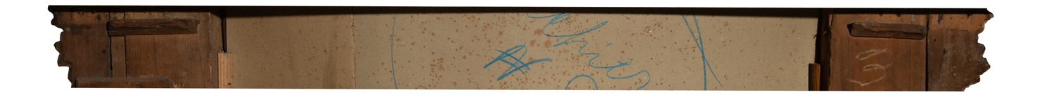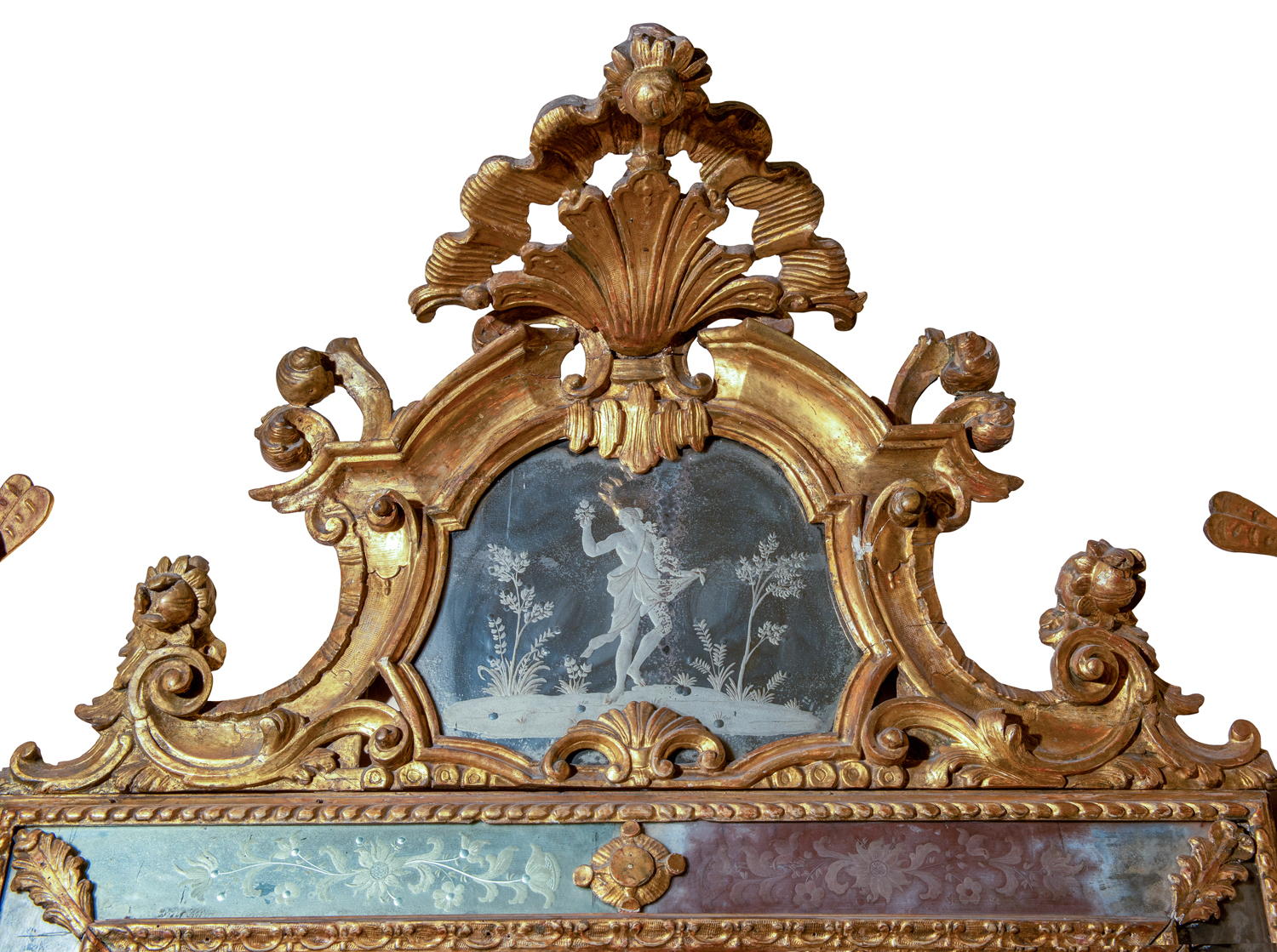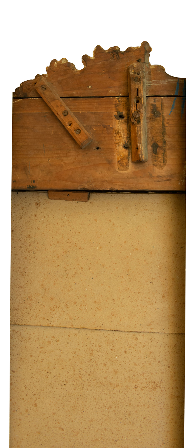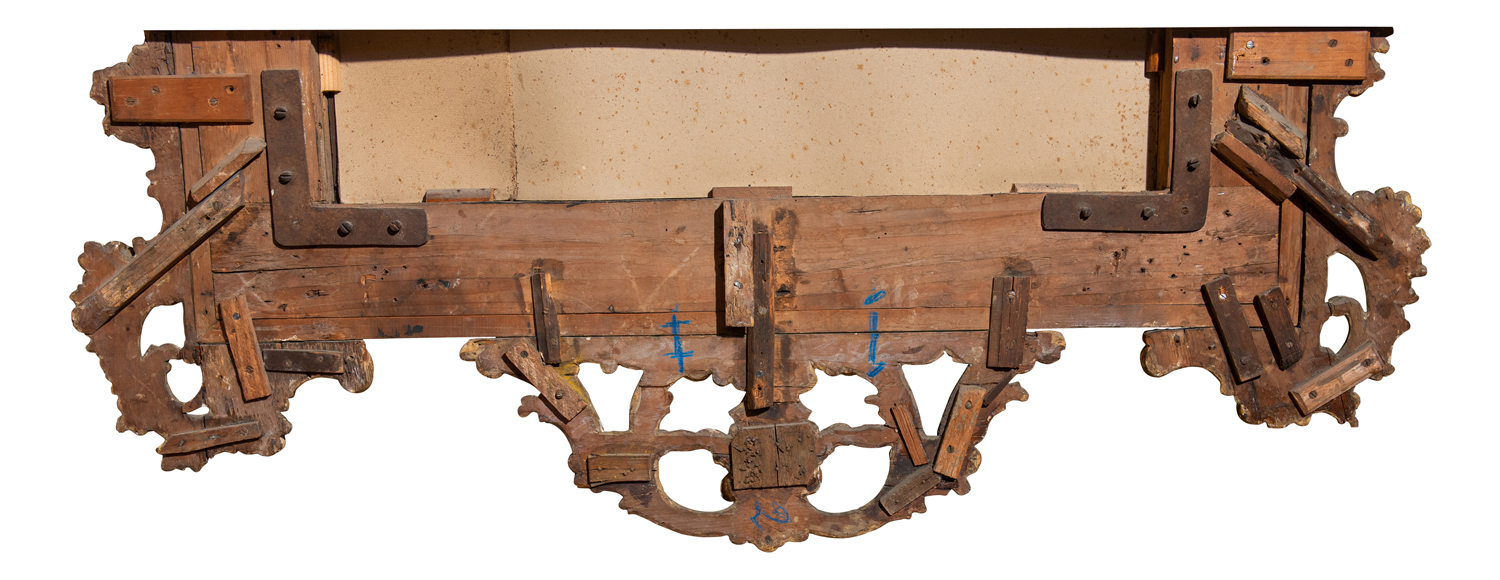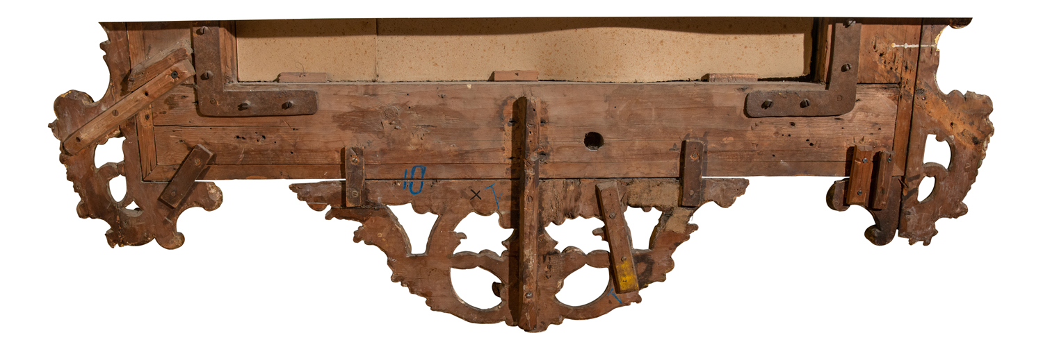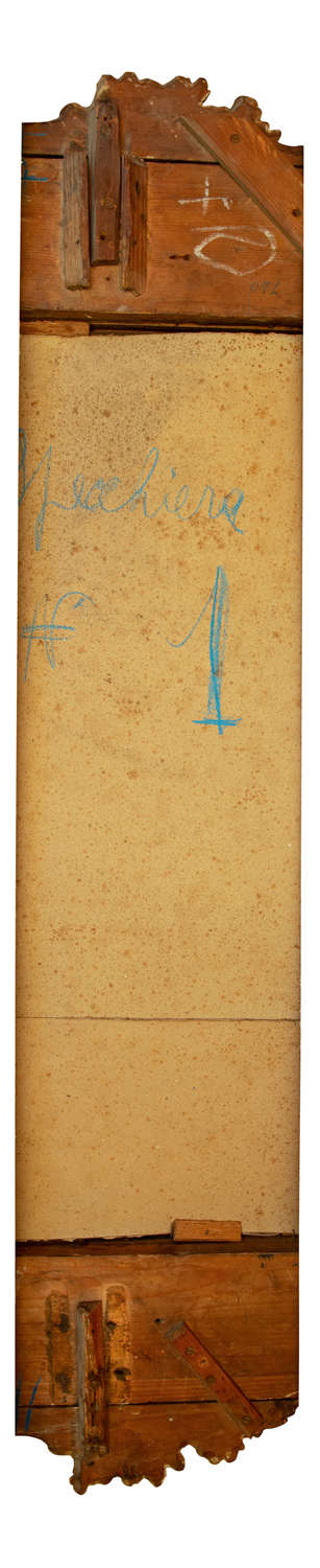 Stato di conservazione. Supporto: 60% (danni da urto con caduta di materiale; molte fratture ricomposte in modo maldestro, tra cui uno dei fregi superiori dei cimieri; vetri centrali non antichi; danni da ossidazione ai vetri; schienali degli specchi centrali sostituti da cartoni; un ricciolo distaccato)