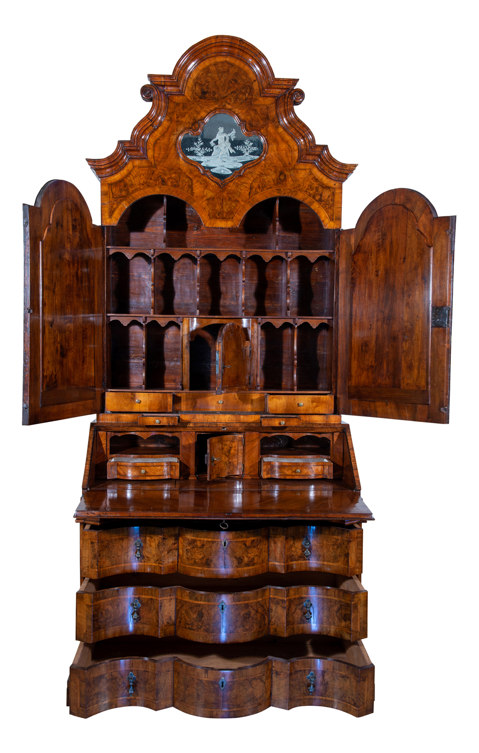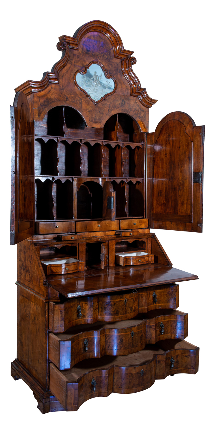 Stato di conservazione. Supporto: 70% (castelletto rifatto; cassetti interni rimaneggiati; cassetti del bureau con segni di scorrimento incongrui; rinforzo in tela su fessura della schiena)