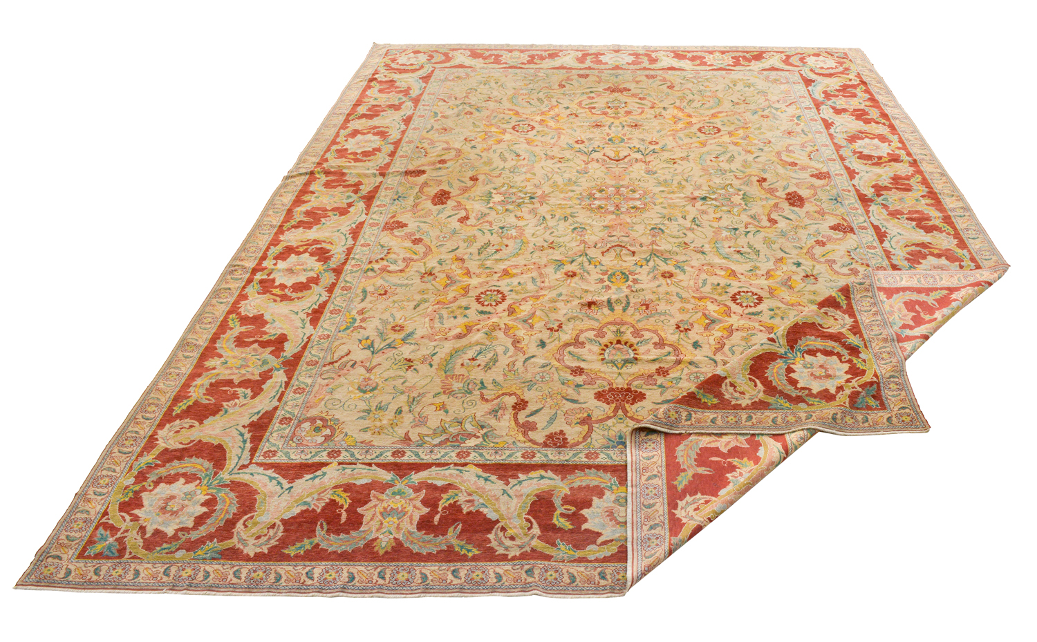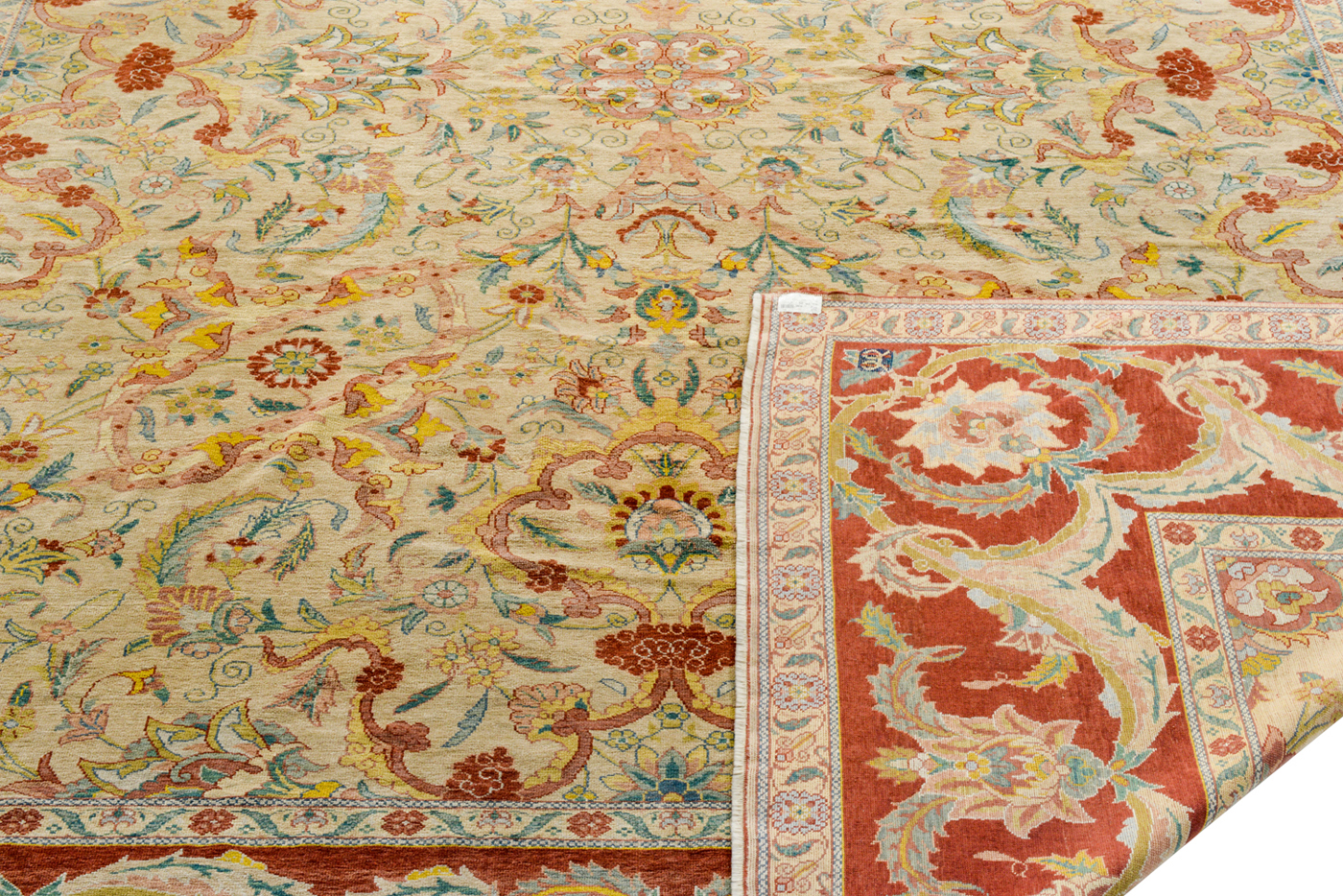 Tappeto decorativo e di grande impatto, con sigla imitativa di tugra (firma sultaniale), che identifica il pezzo come di produzione ricercata ma recente. Disegno con elementi di derivazione ottomana, come palmette, foglie a falce e nastri di nuvole. Il fondo chiaro e il centro molto piccolo lo rendono di facile uso in arredamento.