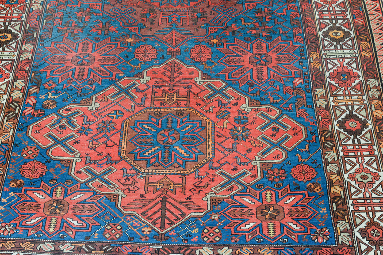 Tappeto con elementi caucasici di varia provenienza: i medaglioni del campo di tipo Konagkendt, con stelle cosiddette “Crivelli”, bordura di tipo cufico, cornice esterna a greca che ricorda i tappeti di Seikhur.