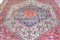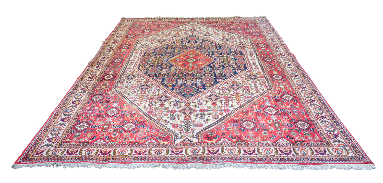 Motivo classico a medaglioni concentrici a forma di losanghe uncinate: il più piccolo, all’interno, in rosso; poi in blu e infine in bianco. Grande ricchezza di decorazioni minute, tipiche della produzione Qashqa’i.