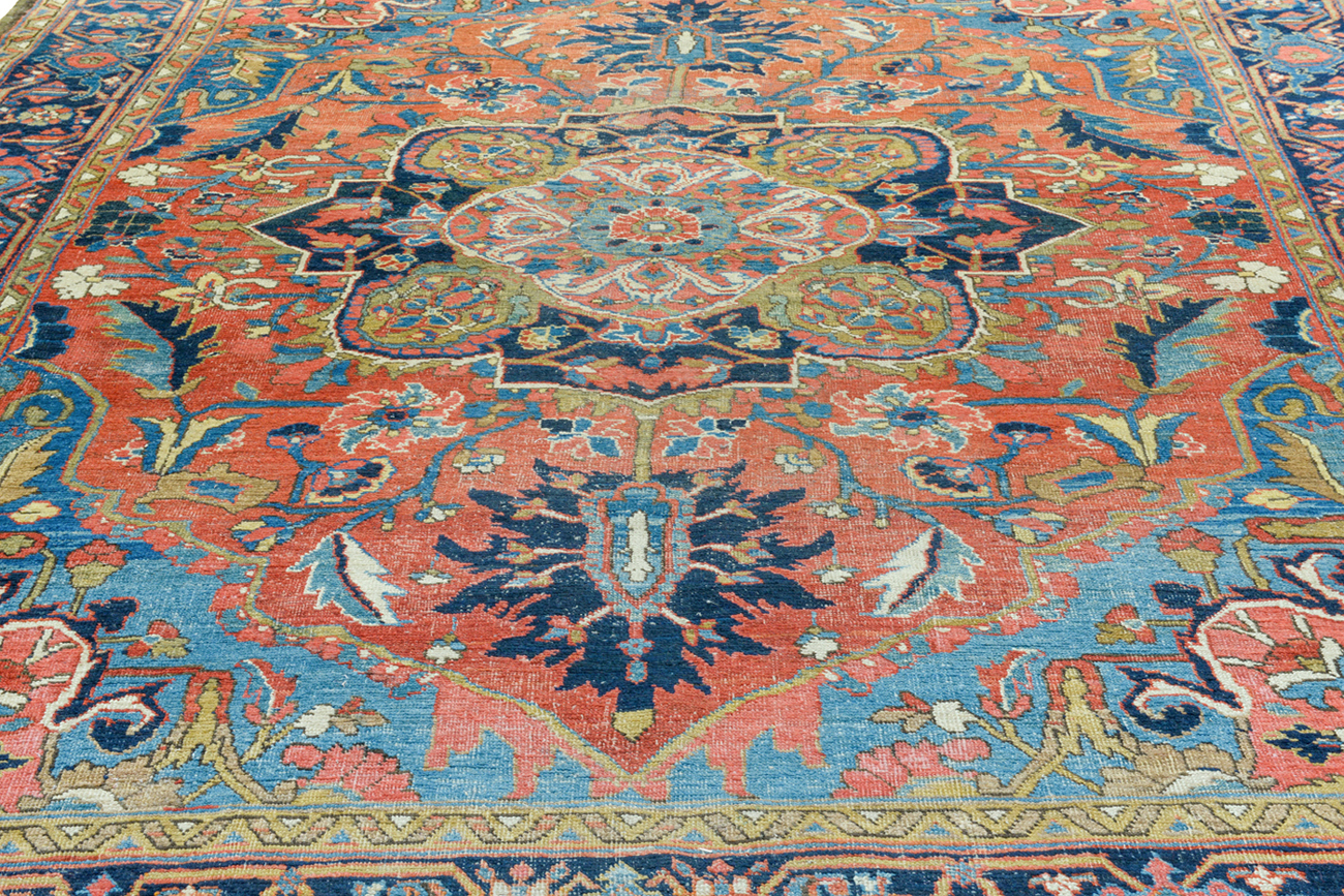 Insolito tappeto di Heriz a grana piuttosto grossa, con un curioso medaglione centrale di forma tondeggiante, accompagnato da due palmette che fungono da pendenti.