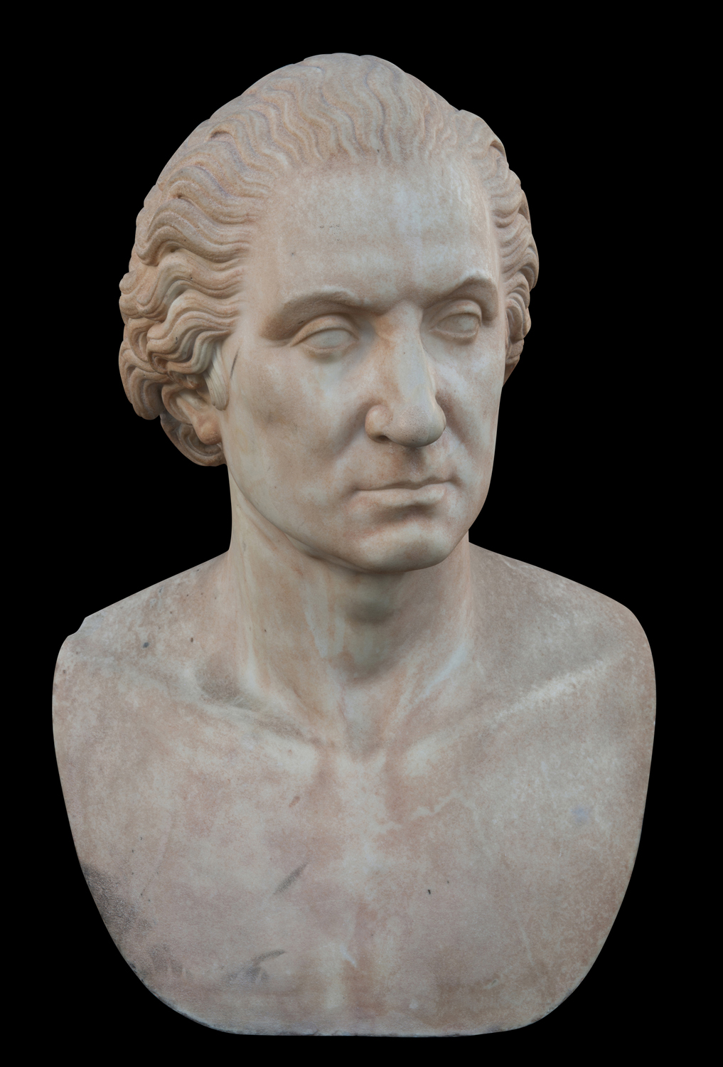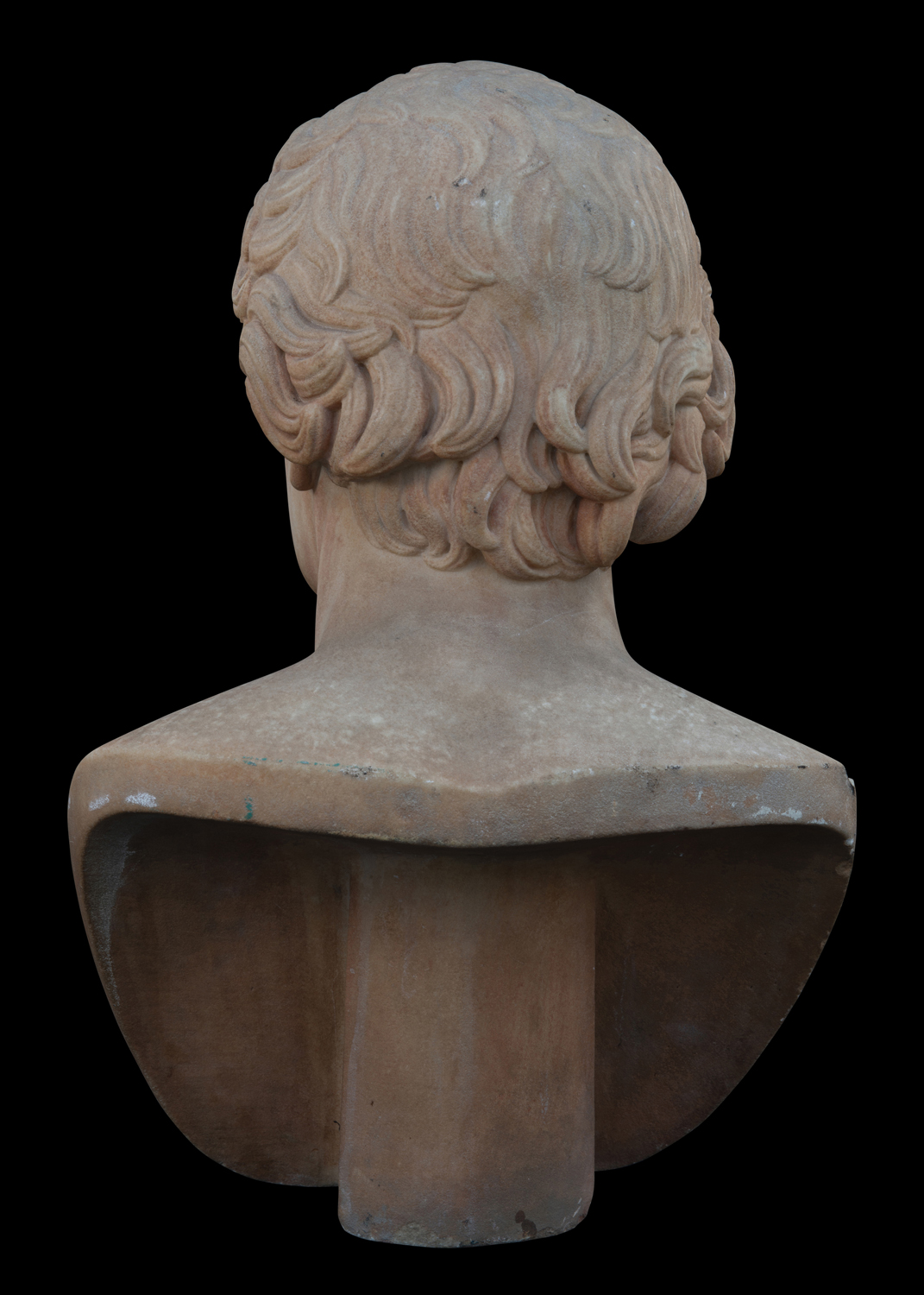 Il busto di Vittorio Alfieri (1749-1803) in asta non risponde ad un modello noto, anche se per modalità esecutive e mancanza di firma fa pensare ad una replica di bottega di un modello illustre. Canova lega il suo nome ad Alfieri: tra il 1804 e il 1810 ne realizza la tomba monumentale, a Santa Croce, presentando lo scrittore di profilo. Tuttavia, la soluzione dell'appoggio (nella parte posteriore) del busto in asta, come si dice, all'eroica non è tipico di Canova, ed anzi gli è un po' successiva partecipando del nuovo clima romantico, come suggerisce Alfonso Panzetta (comunicazione del 23 novembre 2020). L'autore è considerato di difficile identificazione anche da Ferdinando Mazzocca e Giuseppe Pavanello, che pur segnalano l'importanza del soggetto. Secondo il prof. Mazzocca lo stato conservativo suggerisce che la scultura sia stata conservata all'aperto.