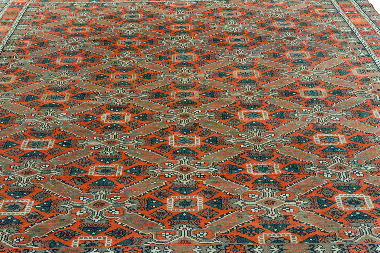 Insolito tappeto caucasico con il motivo a croce di Sant’Andrea tipico dei tappeti Seikhur dell’area di Quba in Azerbaigian ma prodotto in Dagestan come risulta chiaramente dall’iscrizione intessuta.