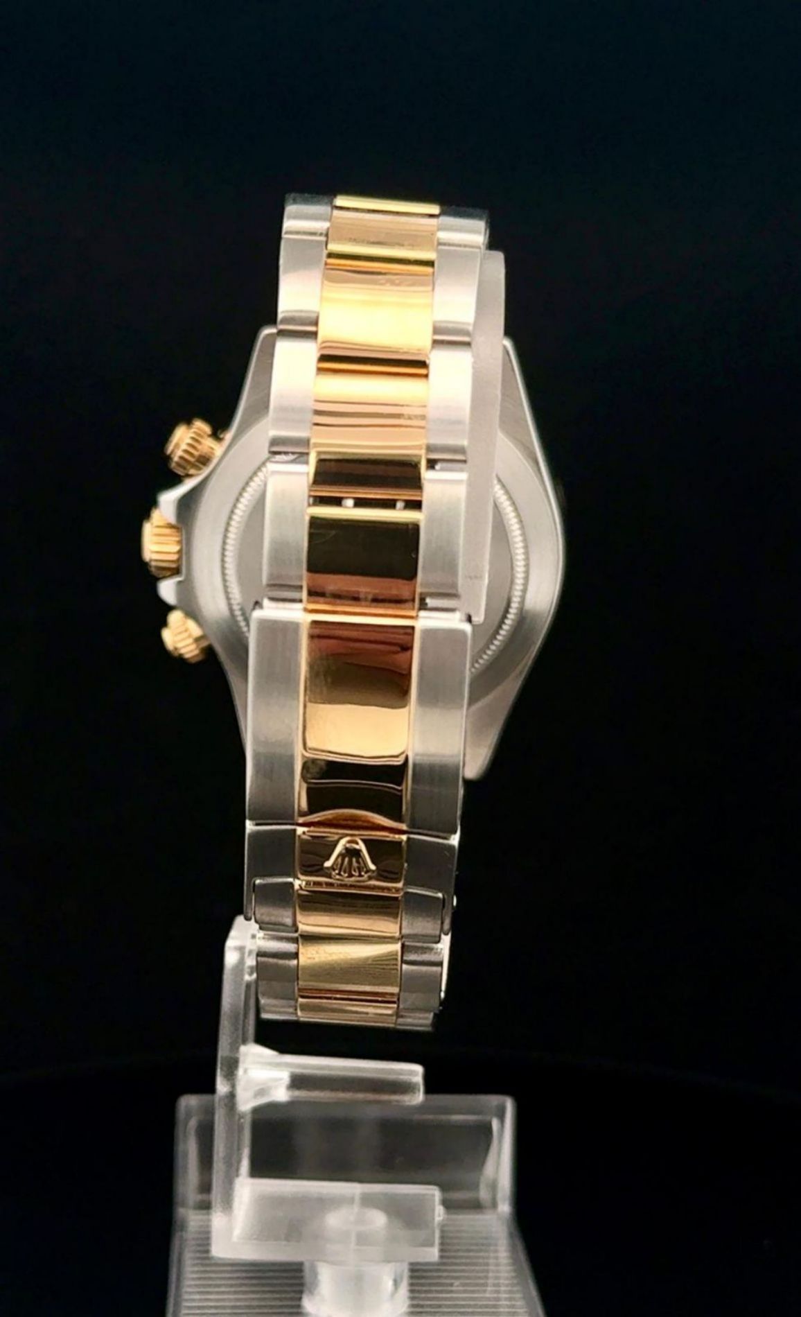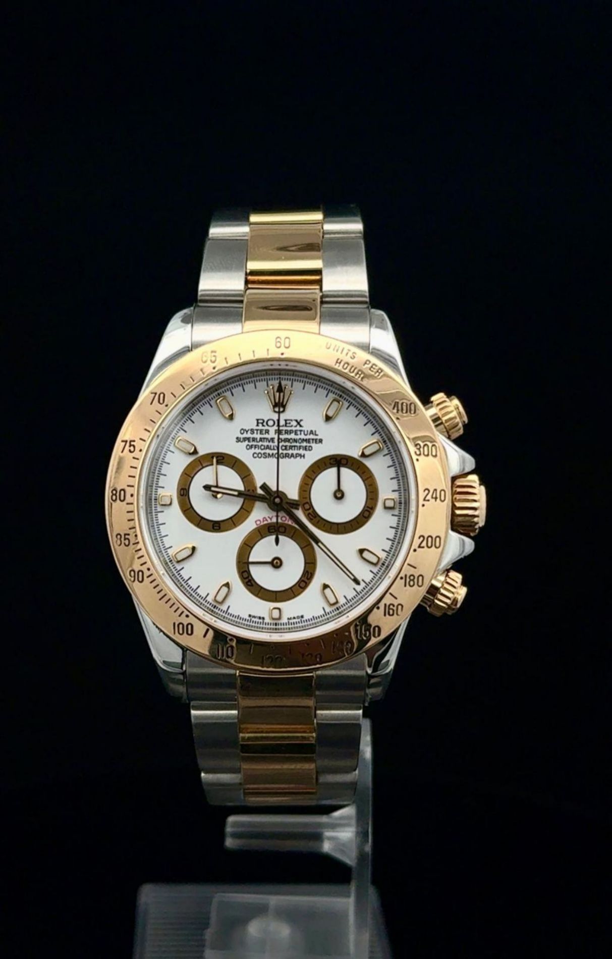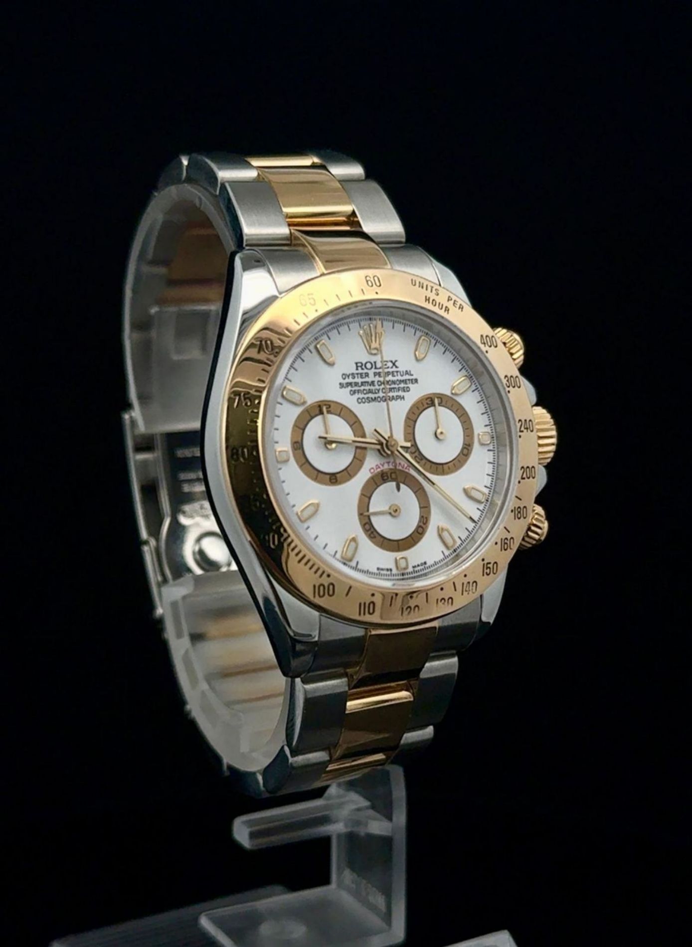 Marca Rolex Modello (Orologio) Daytona Numero di referenza 116523 Carica Automatico Materiale della cassa Oro/Acciaio Materiale cinturino Oro/acciaio Anni 2001/2005 documenti originali Rolex, no box, la scatola viene utilizzata solo per fotografie non è in vendita Calibro Carica Automatico Cassa Materiale della cassa Oro/Acciaio Diametro 40 mm Impermeabile 10 ATM Materiale lunetta Oro giallo Vetro Vetro zaffiro Cinturino Materiale cinturino Oro/acciaio Colore cinturino Oro/acciaio Chiusura Déployante Materiale chiusura Oro/Acciaio Funzioni Cronografo