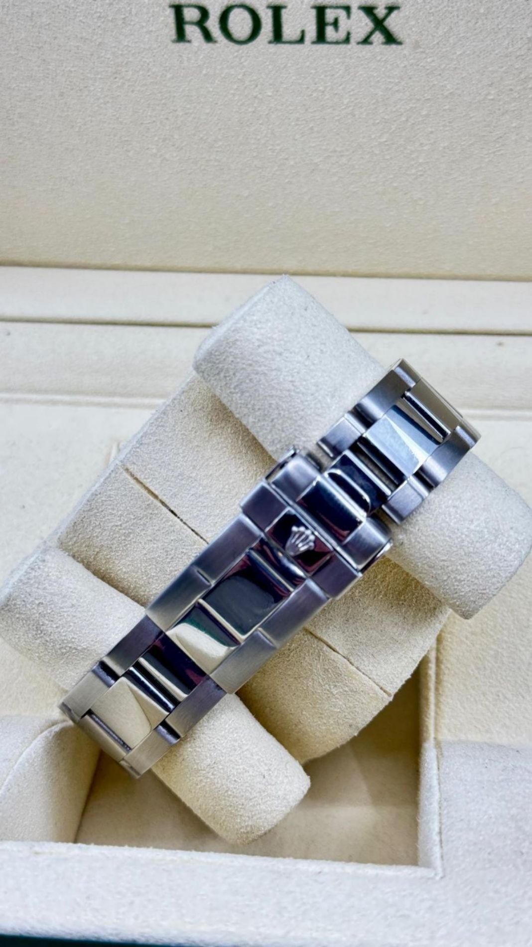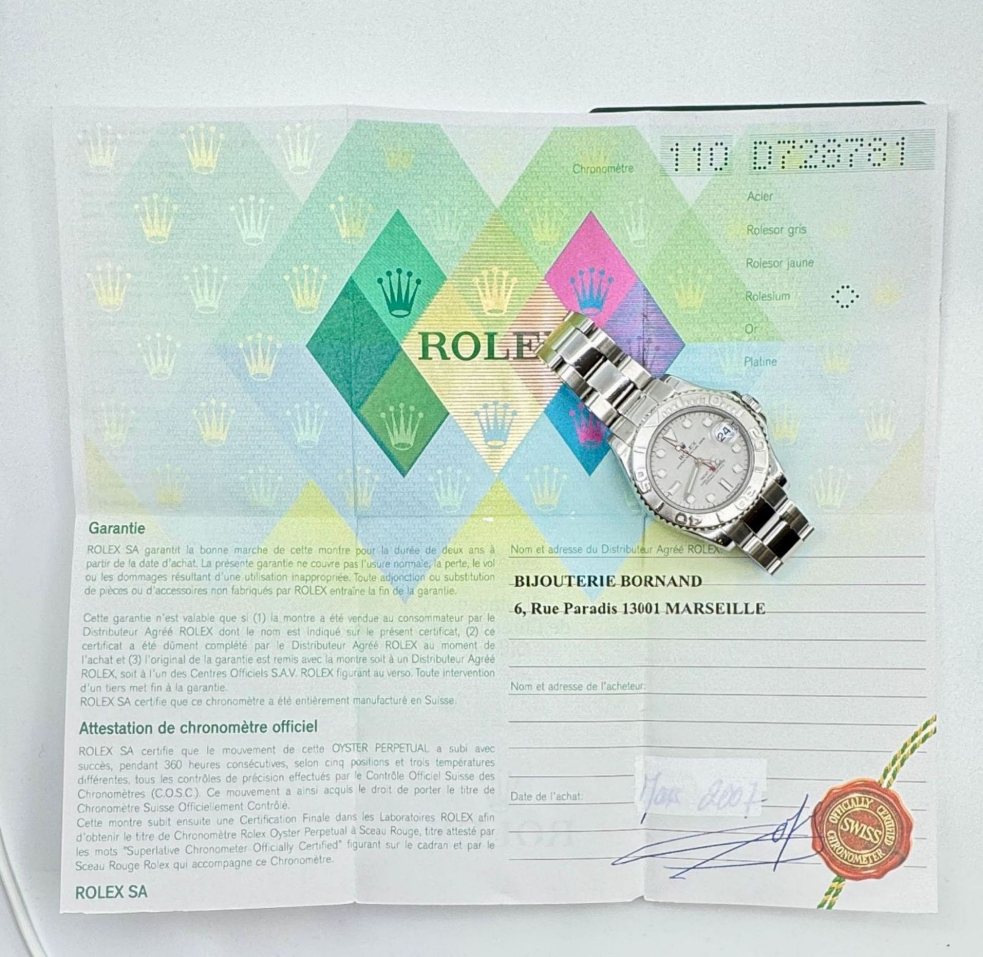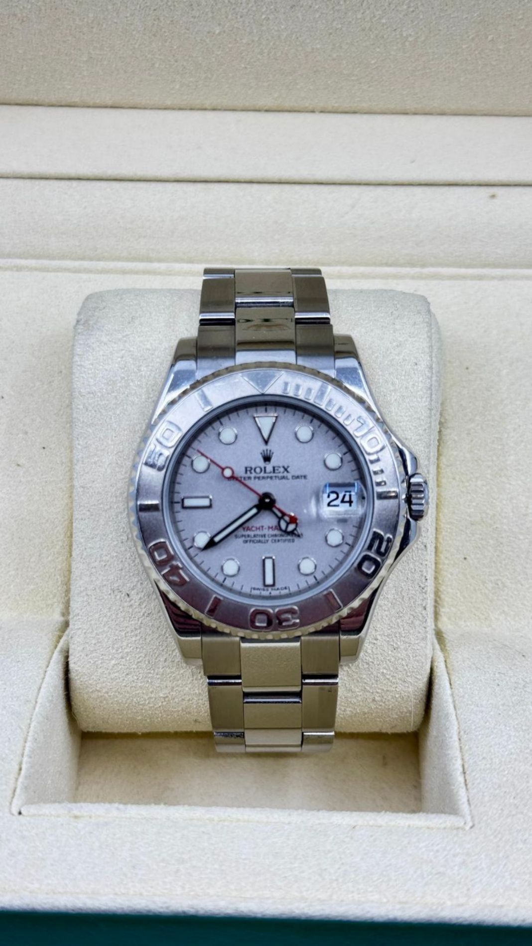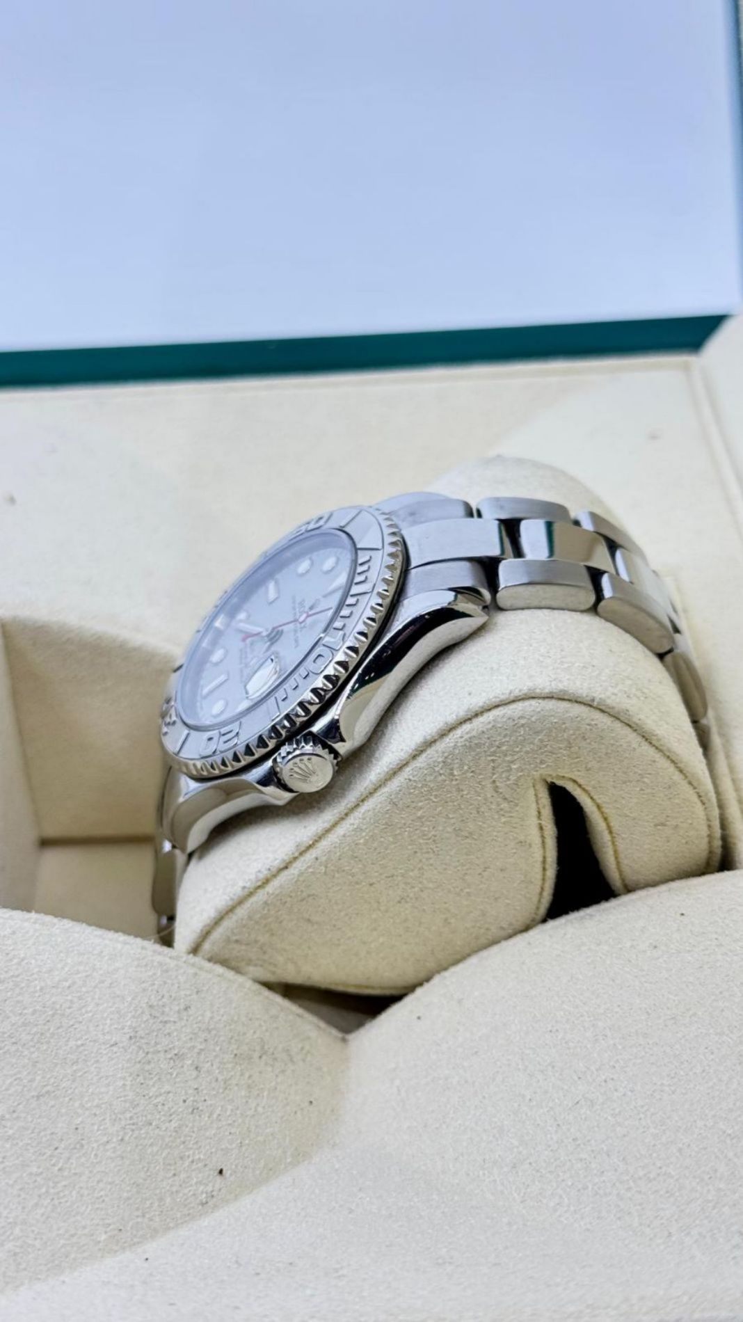 Marca Rolex Modello (Orologio) Yacht-Master Numero di referenza 168622 Carica Automatico Materiale della cassa Acciaio Materiale cinturino Acciaio Anno di produzione 2005 documenti originali, no box Materiale della cassa Acciaio Diametro 35 mm Materiale lunetta Platino Vetro Vetro zaffiro Quadrante Argento Numeri sul quadrante Senza numeri Cinturino Materiale cinturino Acciaio Colore cinturino Acciaio Chiusura Déployante Materiale chiusura Acciaio