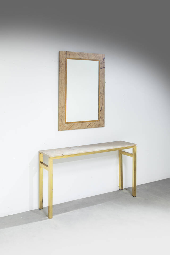 Struttura in ottone, piano in travertino e vetro specchiato.