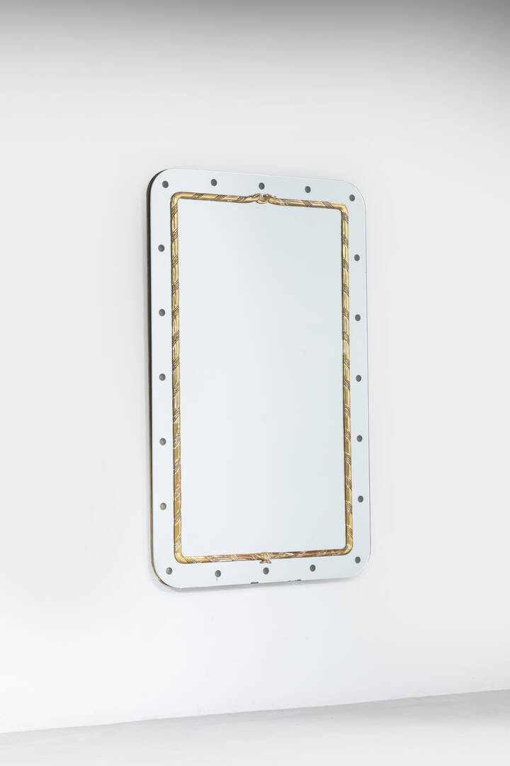 Vetro specchiato e particolari in legno sagomato e dorato.
