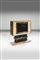 Struttura in legno con decori dipinti, apertura a ribalta in legno nero, interni in vetro specchiato e particolari in ottone.